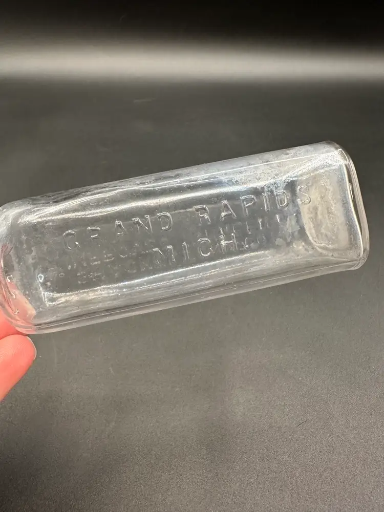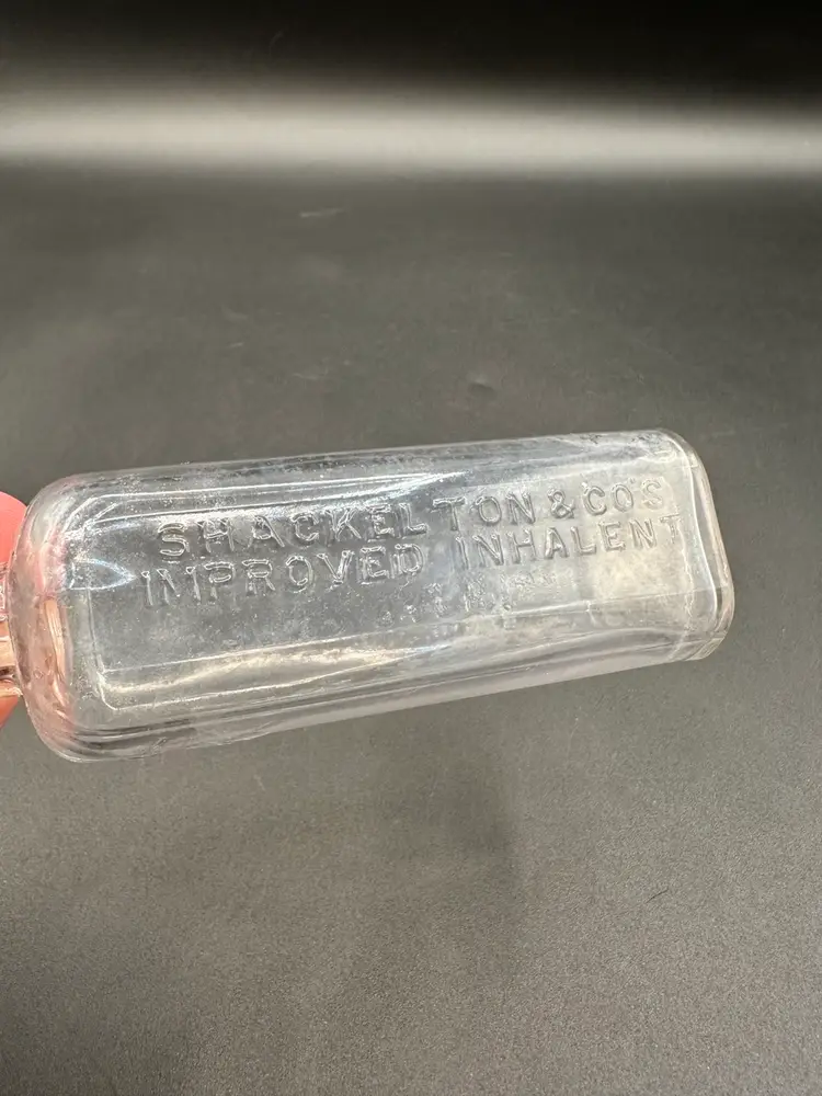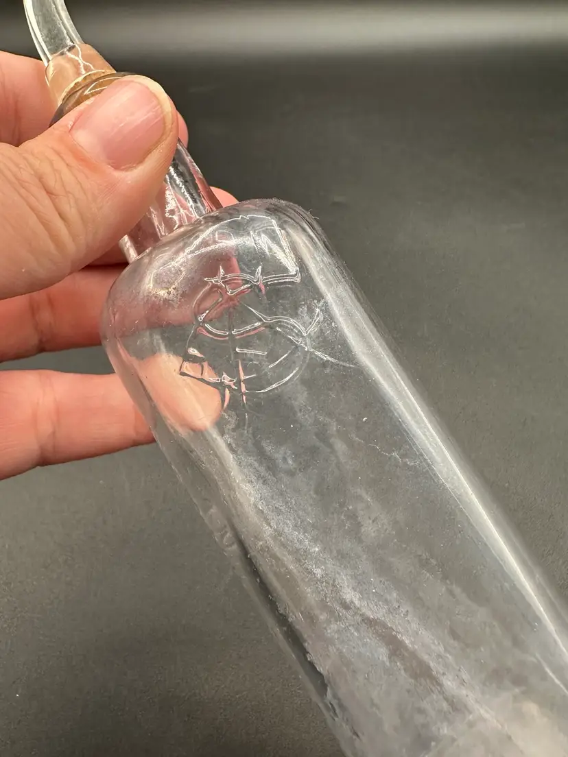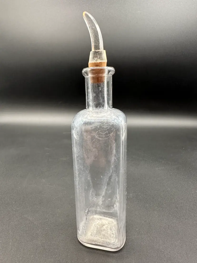 Woo! This is one cool bottle. It’s been washed several times, so whatever inhalant was in the bottle may have dried up in there-which makes it even cooler! The logo is fire. Measures 5.5” to the top of the bottle, a smidge over 7” with the claw lucite stopper.
