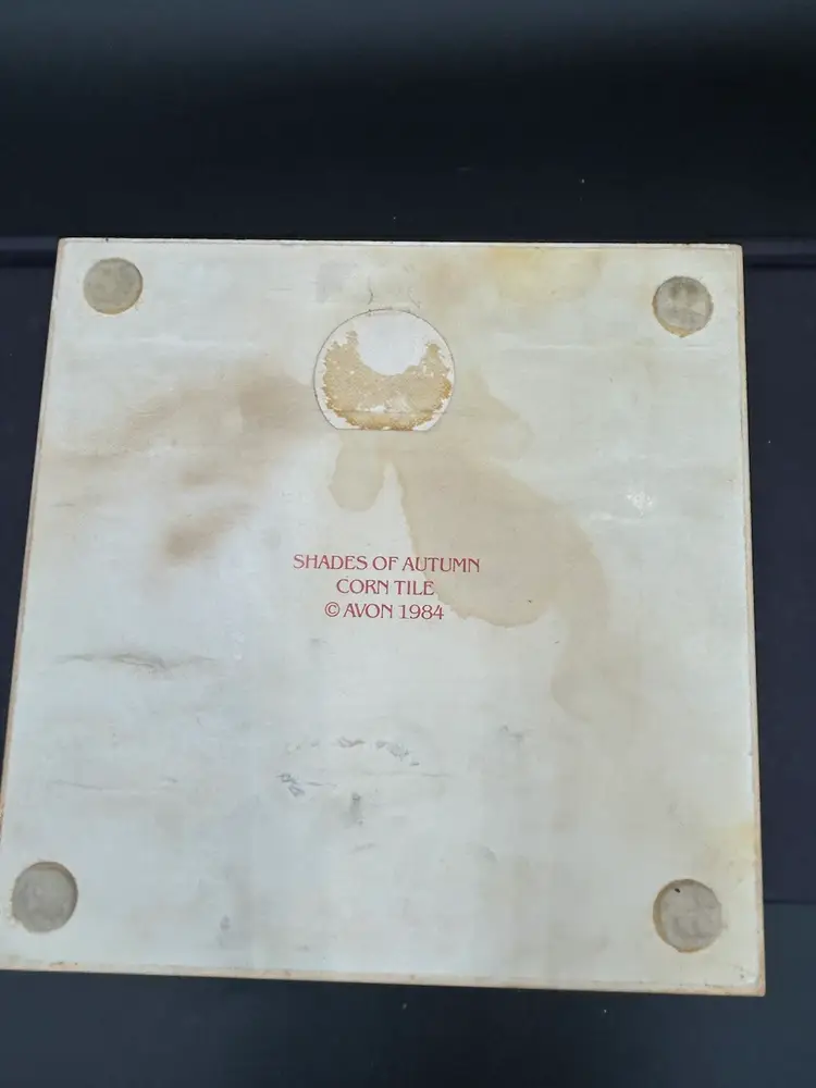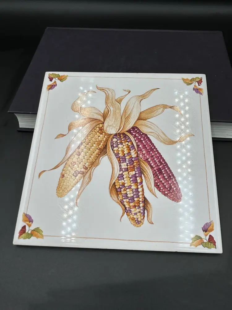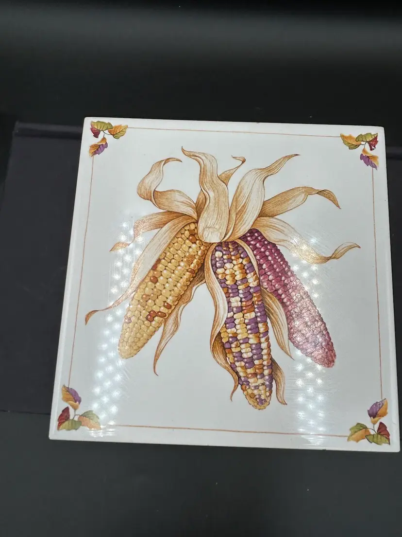 6” x 6” tile or trivet decorated with “Indian” corn in fall shades. Excellent condition.