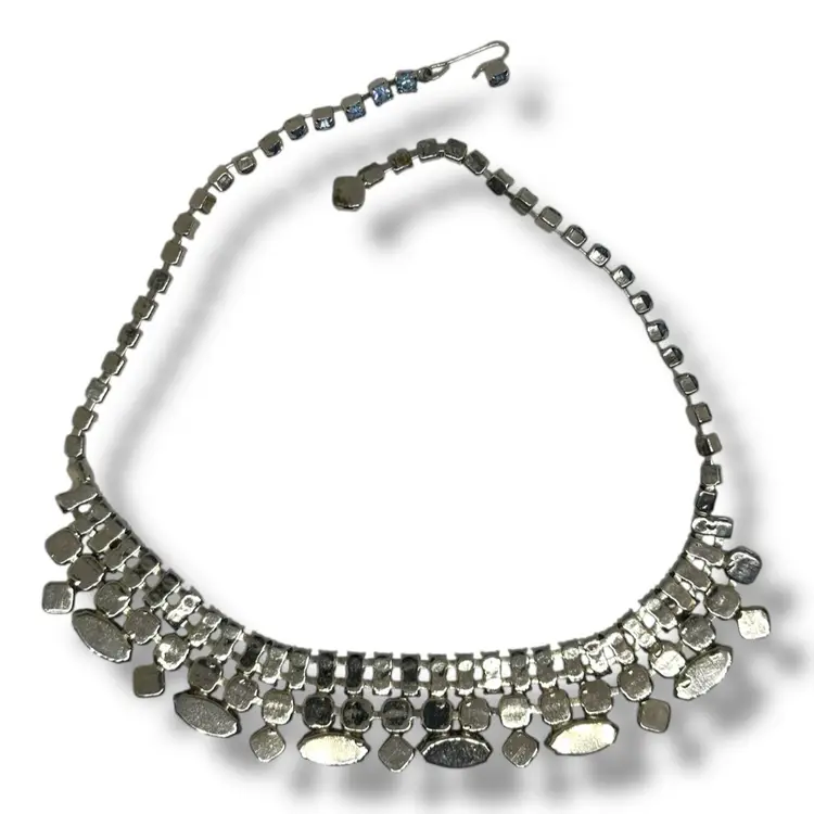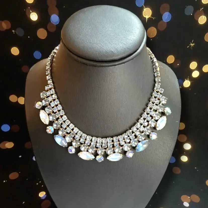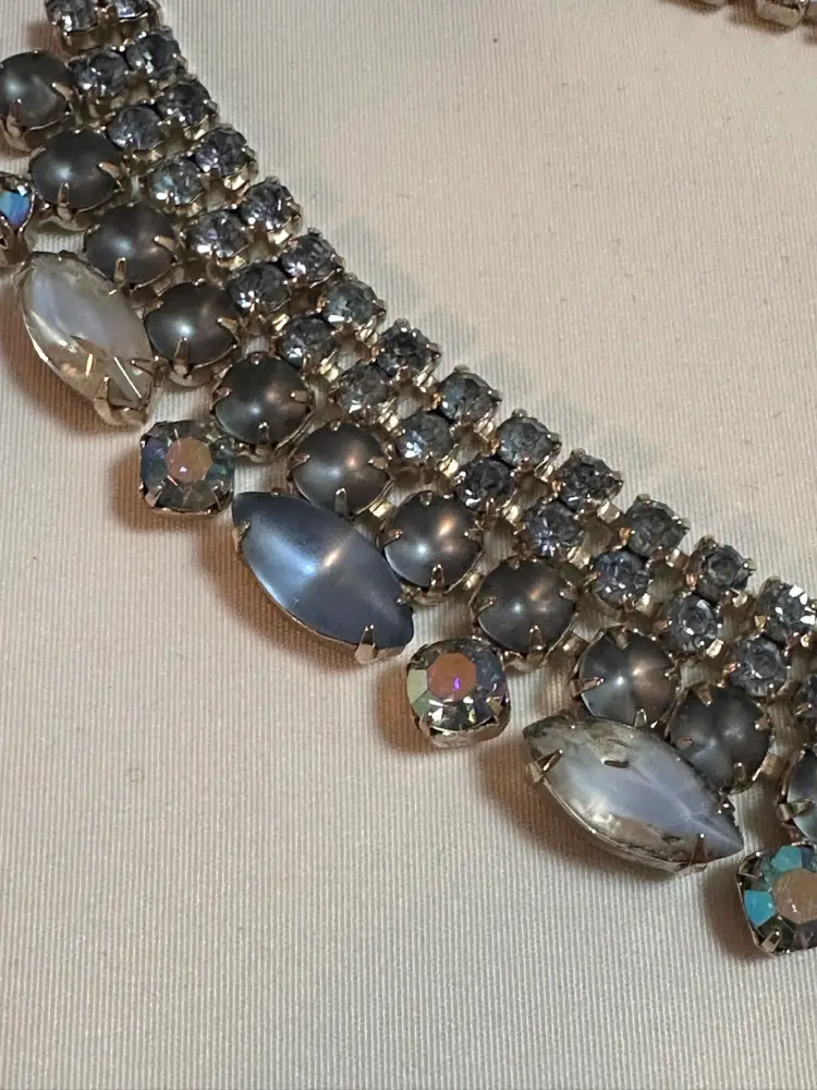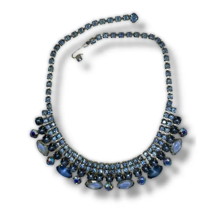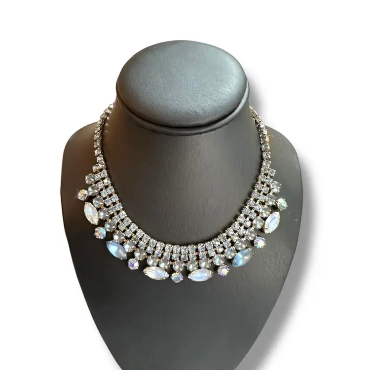 16 inches Adjustable length. Shades Of Blue! Stunning Vintage silver-tone rhinestone choker necklace featuring aurora borealis and moonstone-like marquise and chaton stones. 1950s/1960s