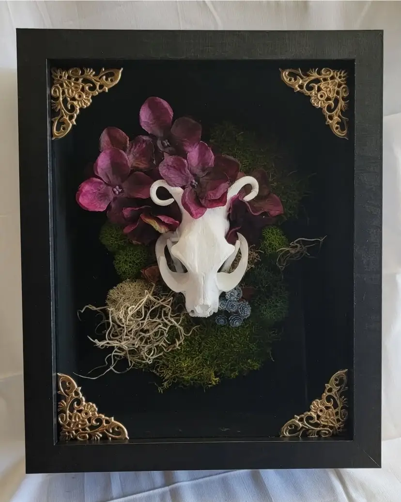 Shadow box with clay cat skull with horns, and faux flora. One of four in series.