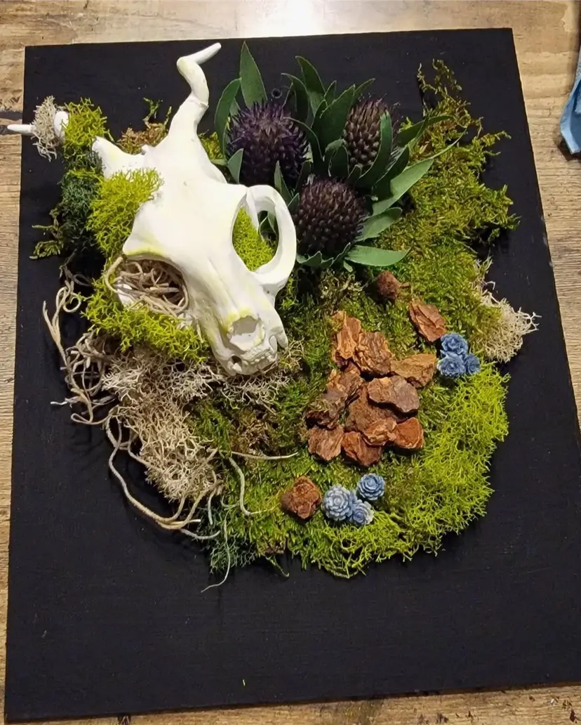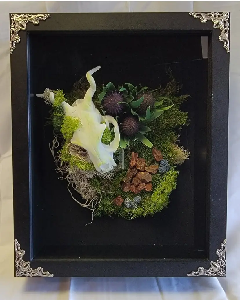 Shadow box with clay cat skull with horns, and faux flora. One of four in series.