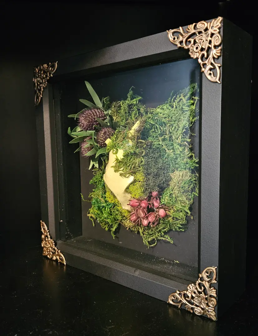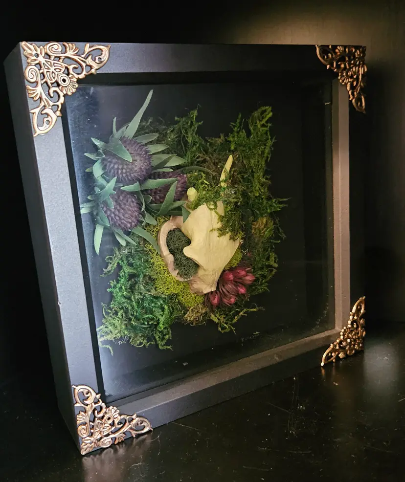 Shadow box with clay cat skull with horns, and faux flora. One of four in series.