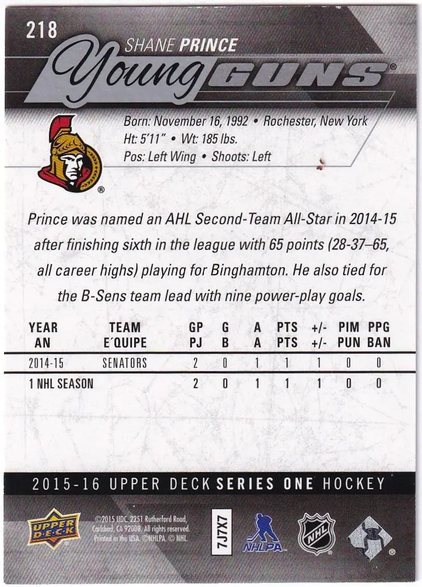 2015-16 Upper Deck #218 Shane Prince YG RC Ottawa Senators Young Guns