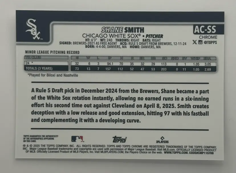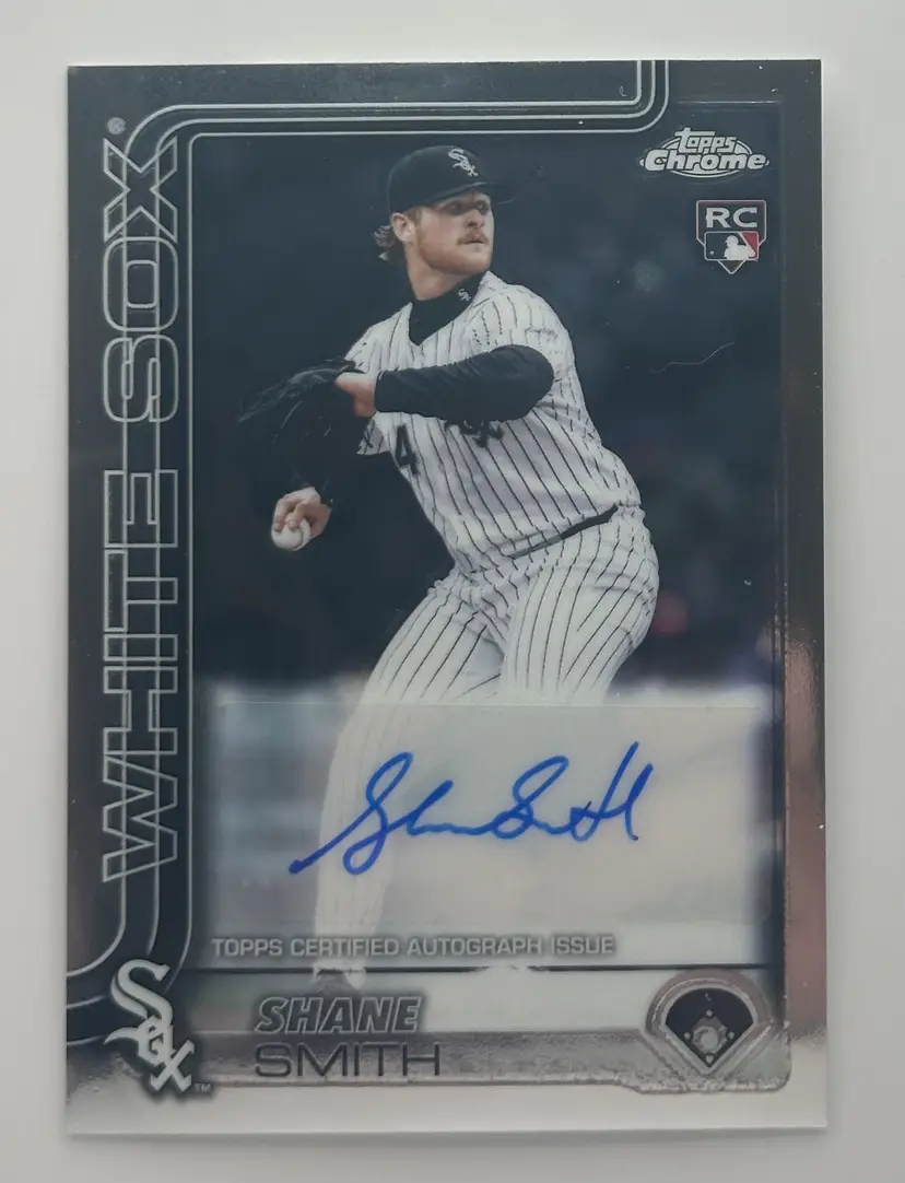 Add this Shane Smith rookie card from Topps Chrome to your collection, featuring his autograph and celebrating his time with the White Sox.