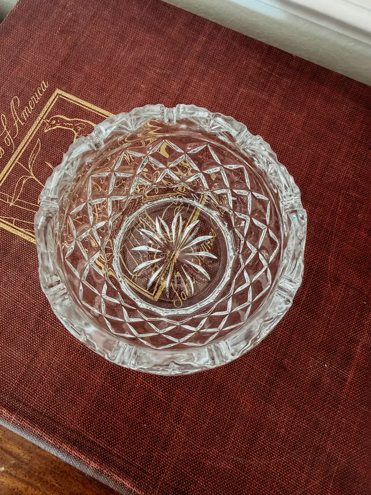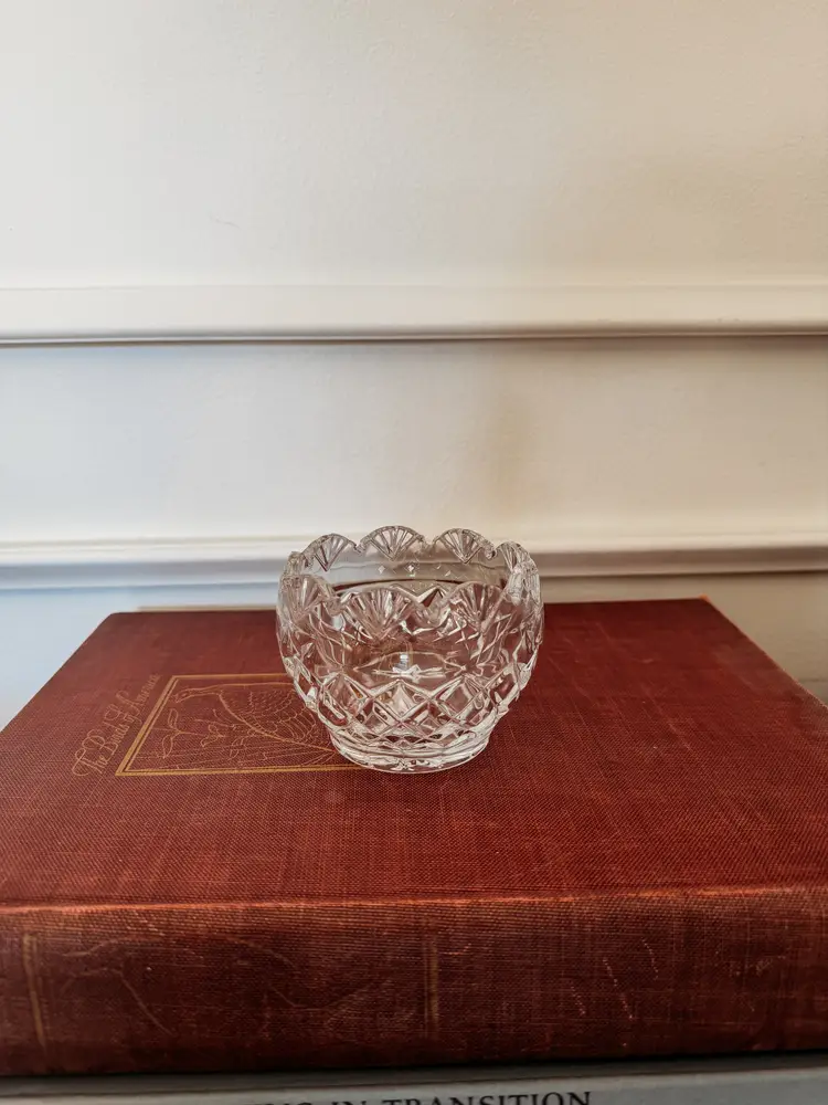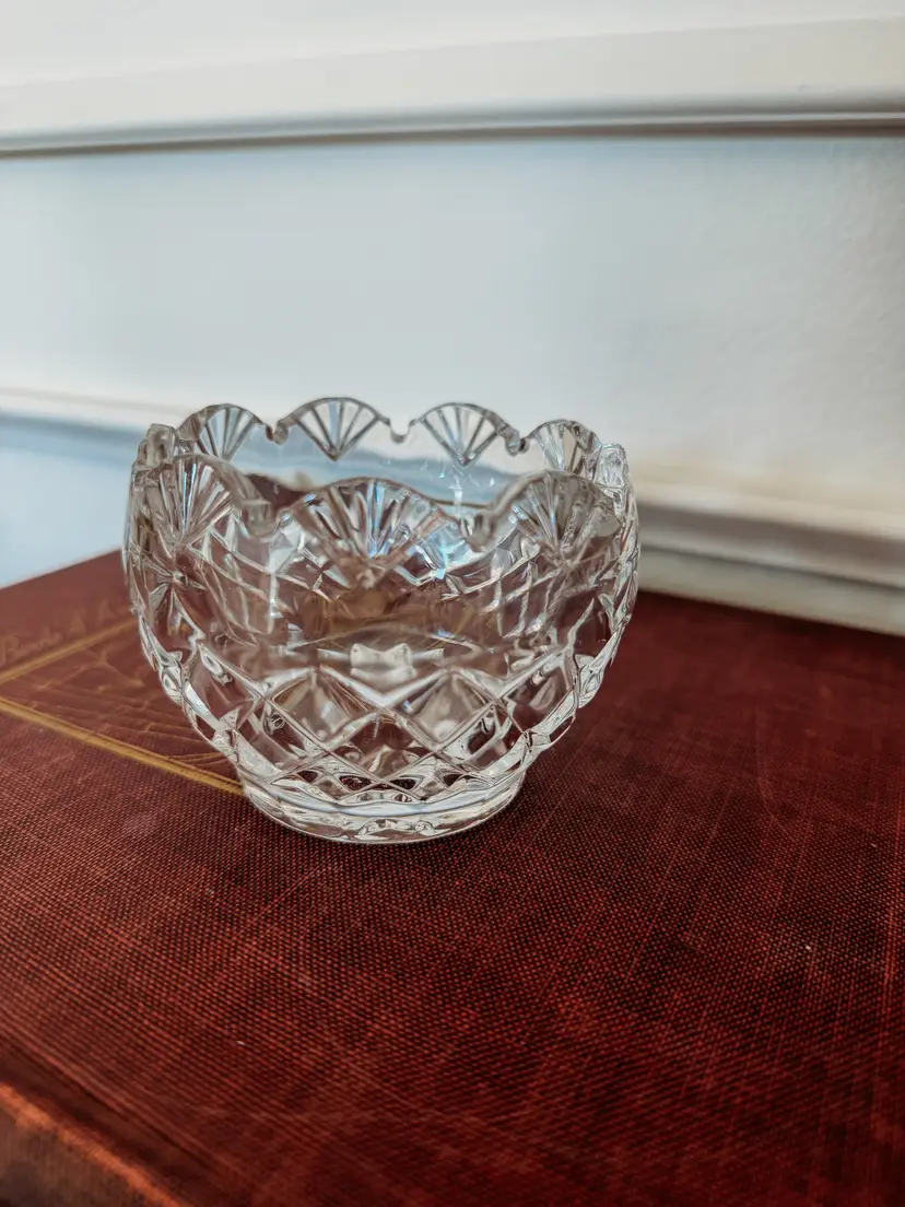 This item is a Shannon 24% Lead Crystal small bowl or votive holder, handcrafted in Ireland and featuring a distinctive diamond pattern on the body with a scalloped fan pattern along the top edge. Approximately 3 inches tall and 3 inches wide.