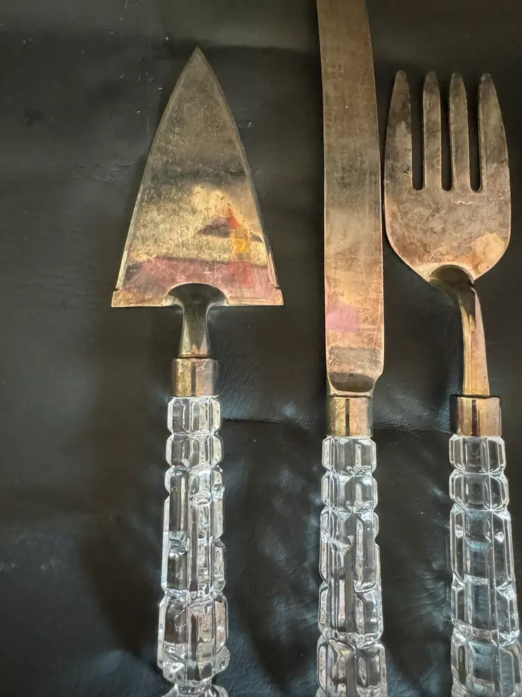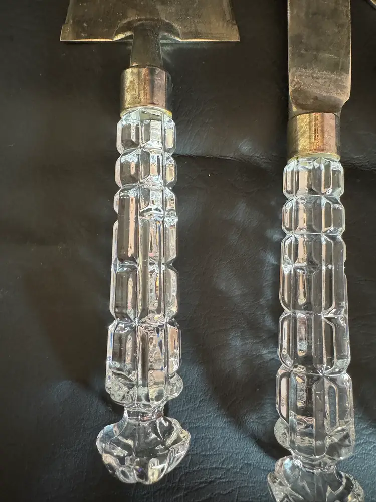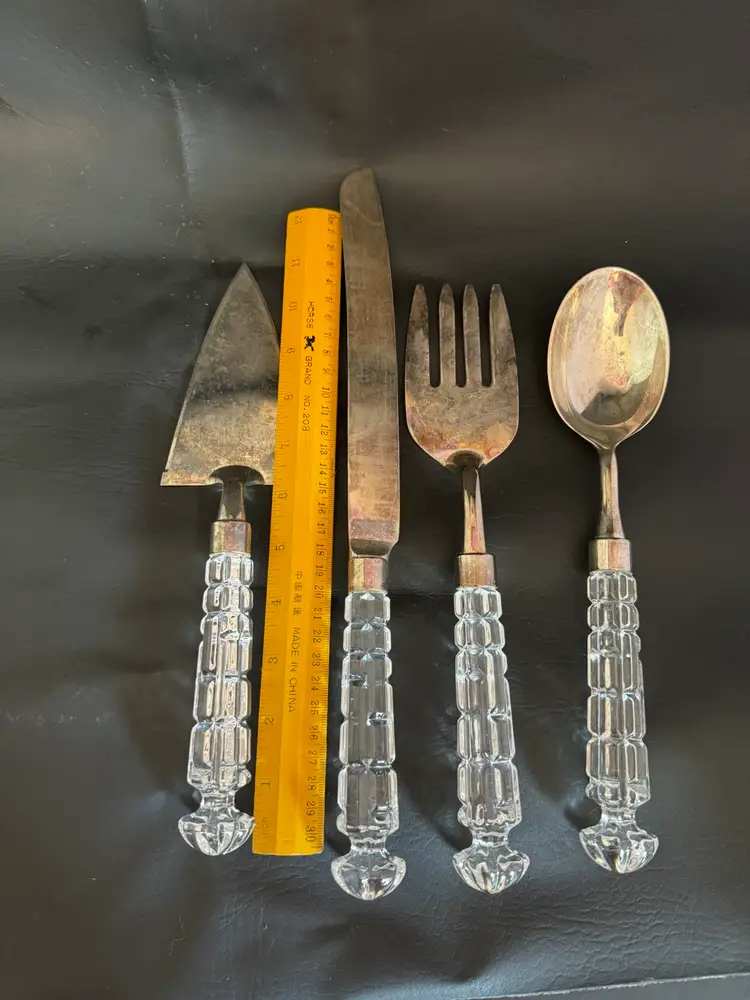 Presenting the elegant Shannon Crystal by Godinger Versailles 4 Piece Crystal Handled Serving Set. This set includes a knife, fork, serving spoon, and cake/pie slice, all crafted with precision and care. The set features a beautiful silver color and is made of crystal glass, stainless steel, and silver plated materials.
