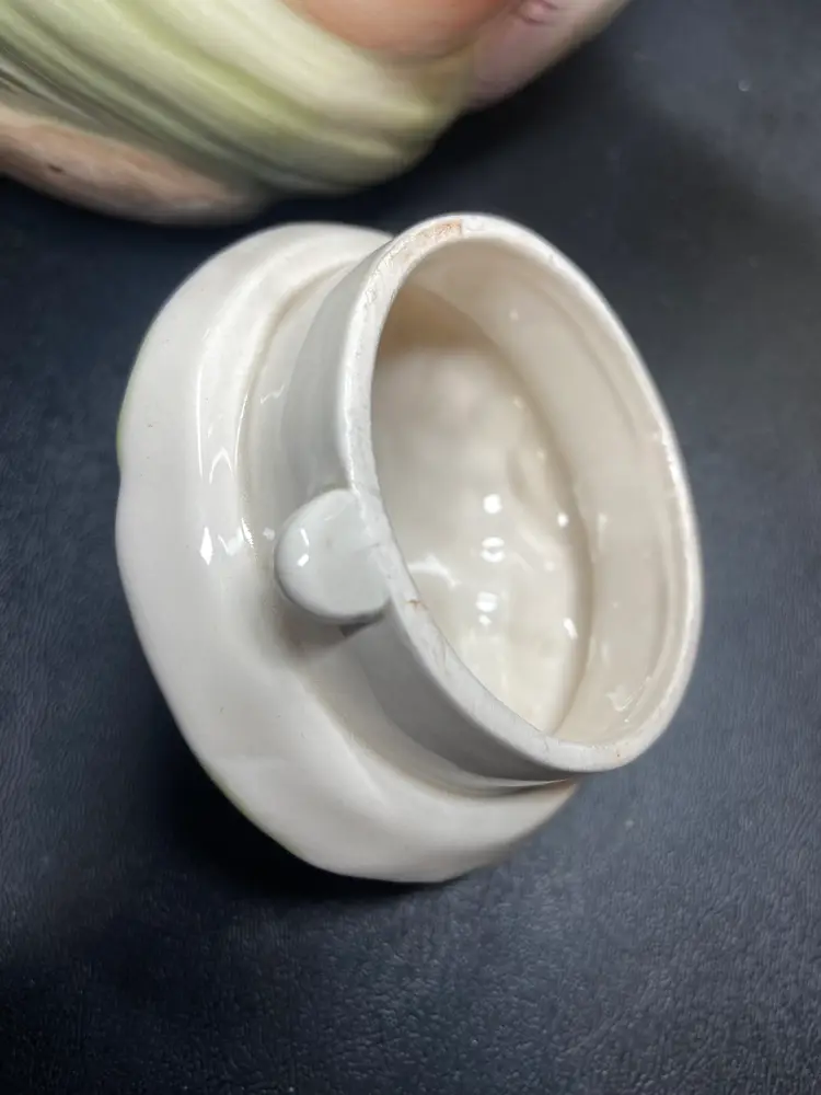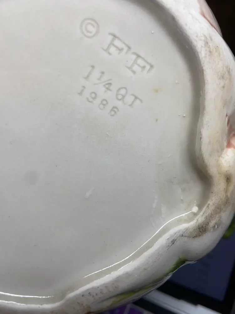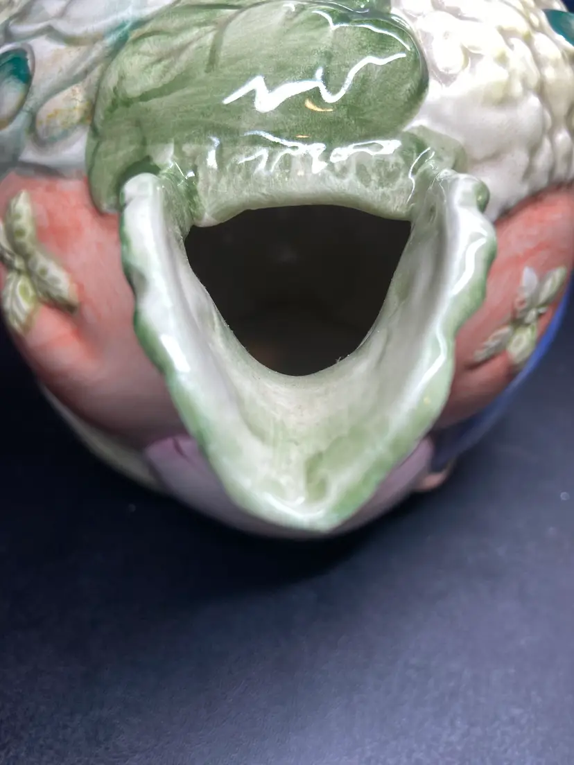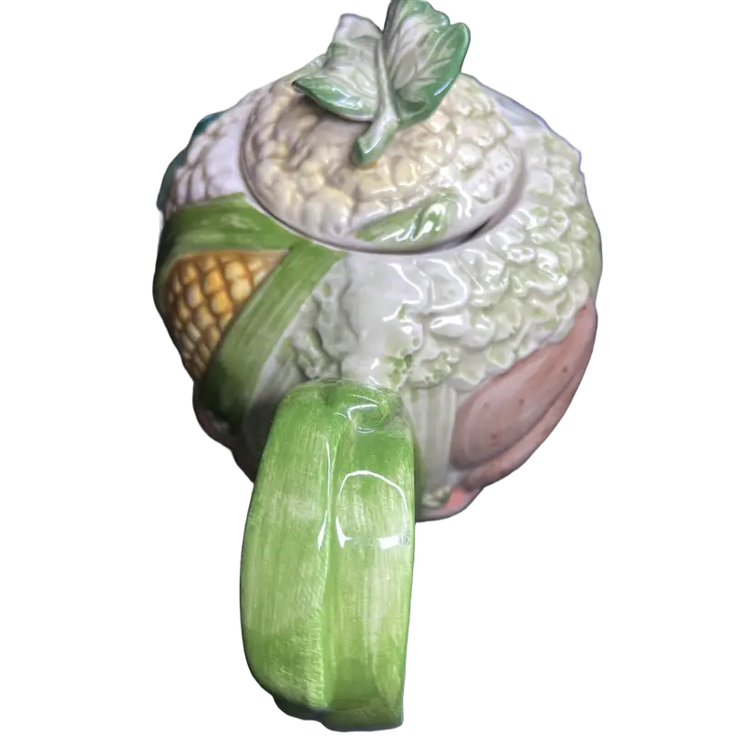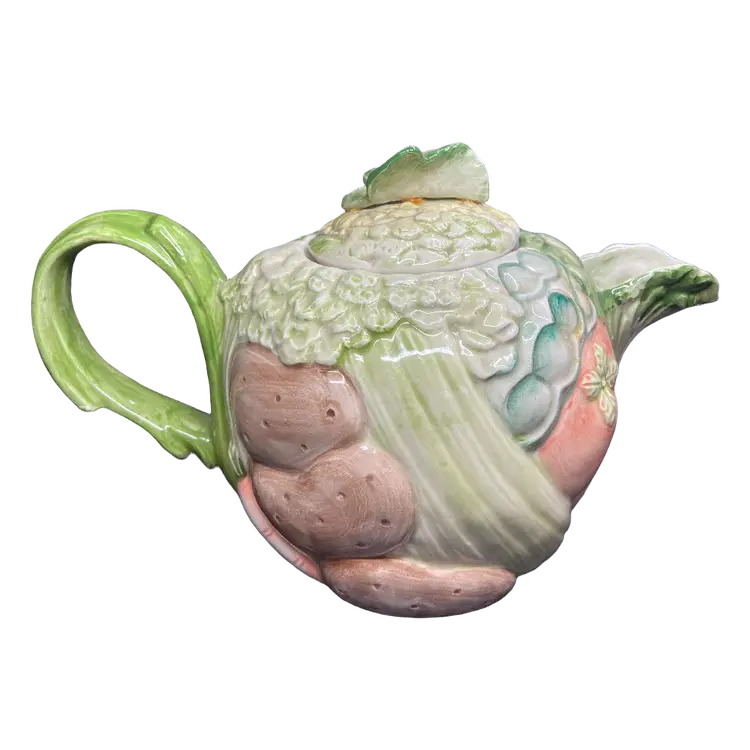 The 1986 Vintage Handpainted Fitz & Floyd Vegetable Garden Teapot is a charming and vibrant piece of ceramic art. Standing at 7" tall, this glossy finished teapot features a colorful handpainted design of a vegetable garden, adding a whimsical touch to any table setting. Made in Taiwan in 1986, this teapot is a collectible vintage piece that is not only functional for serving tea but also decorative for displaying in a kitchen or dining room. With its unique design and high-quality craftsmanship, this teapot is sure to be a standout piece in any collection.