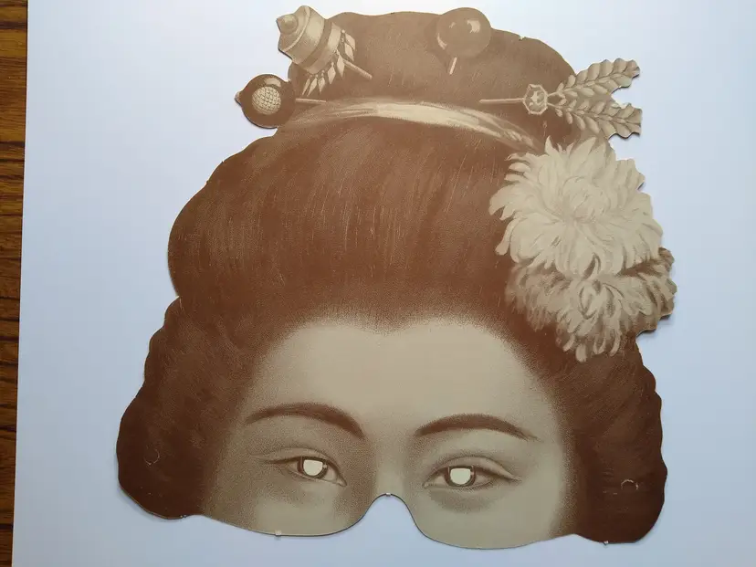 This unique mask is ideal for collectors of vintage ephemera, costume enthusiasts, or anyone seeking a distinctive accessory for themed events, cosplay, or theatrical productions. Its detailed illustration and classic design make it a captivating piece. This listing includes one paper mask as pictured, featuring the Asian woman's face with ornate hair and a large floral accent.