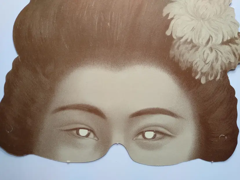 Verified Specifications: Brand/Maker: Unbranded Item Type: Eye Mask / Costume Accessory Era/Style: Vintage, Geisha Style, Traditional Asian Design Material: Paper / Cardboard Features: Printed graphic, Eye cutouts, Holes for string attachment Included Components: 1x Paper Mask (as pictured) Country of Origin: Not visible
