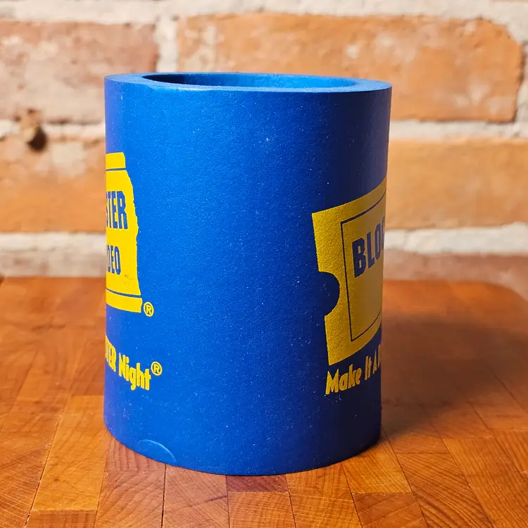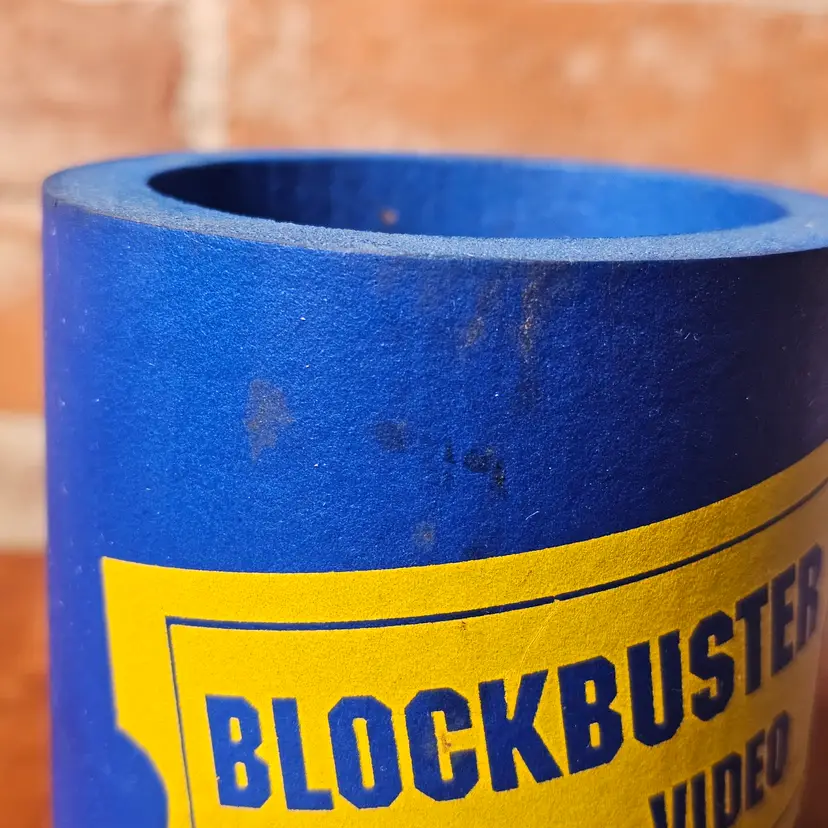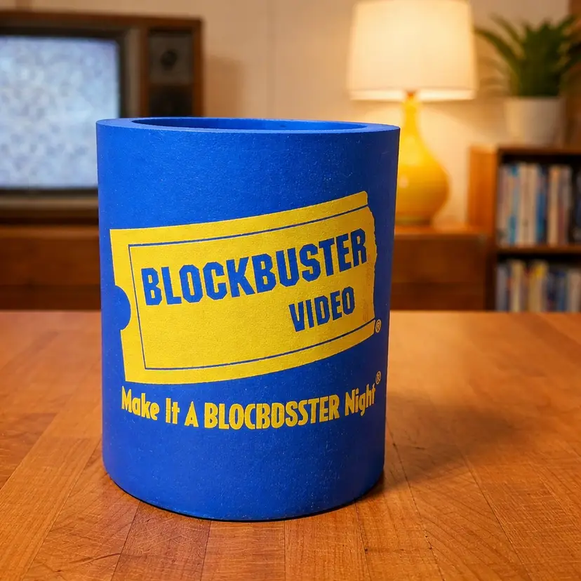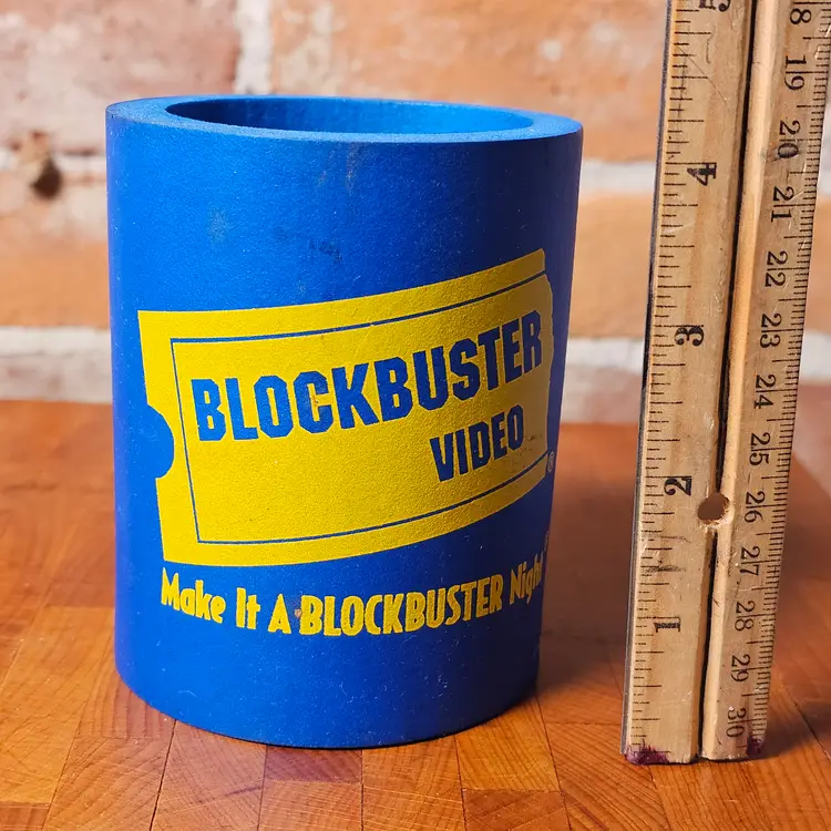 Details: • Blue foam can cooler • Yellow Blockbuster Video logo • Slogan printed on front • Fits standard 12 oz can • Lightweight foam material