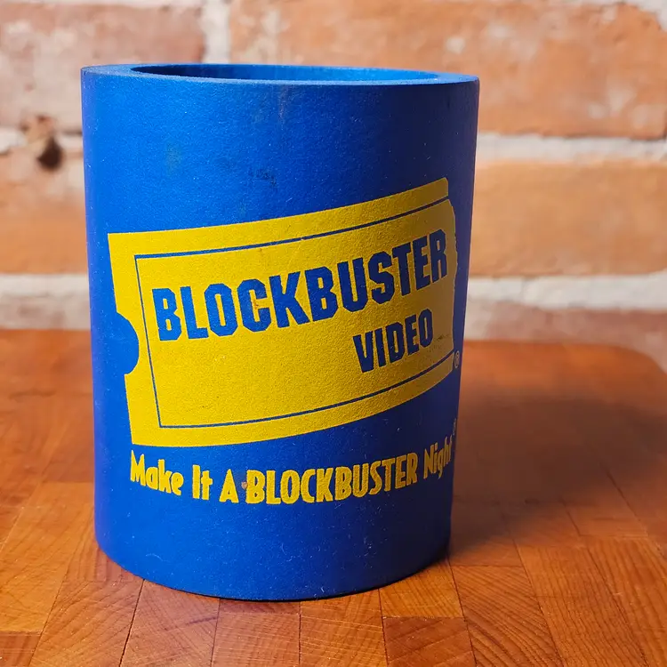 Original vintage Blockbuster Video foam can cooler featuring the classic blue and yellow logo and the slogan: