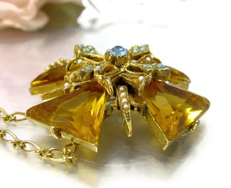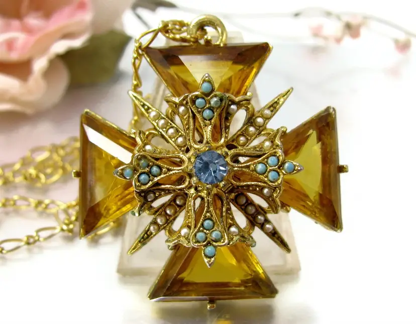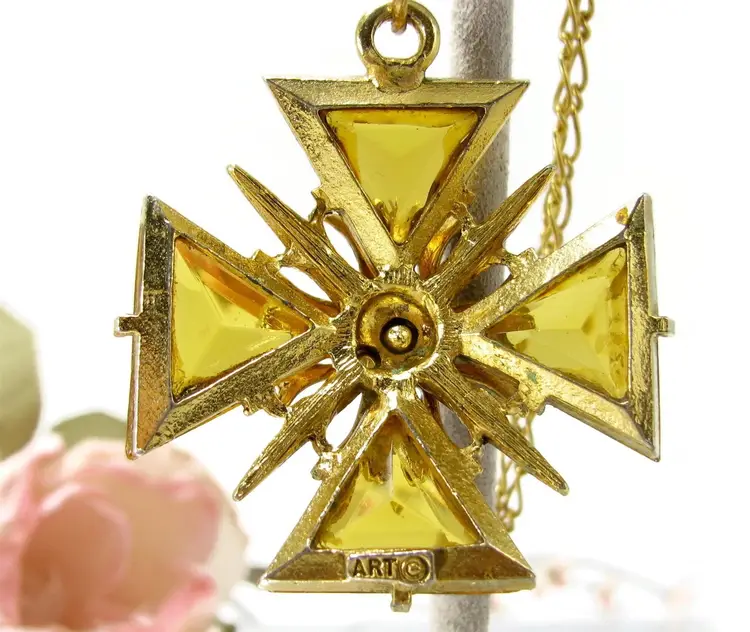 This wonderful vintage pendant necklace was produced by Art Pepper Jewelry Company (ART) and features the design of a Maltese set with 4 large citrine colored glass piece, highlighted by small seed pearls, turquoise balls and a sparkling blue rhinestones in the center. The pendant is strung on a figaro like gold tone chain.