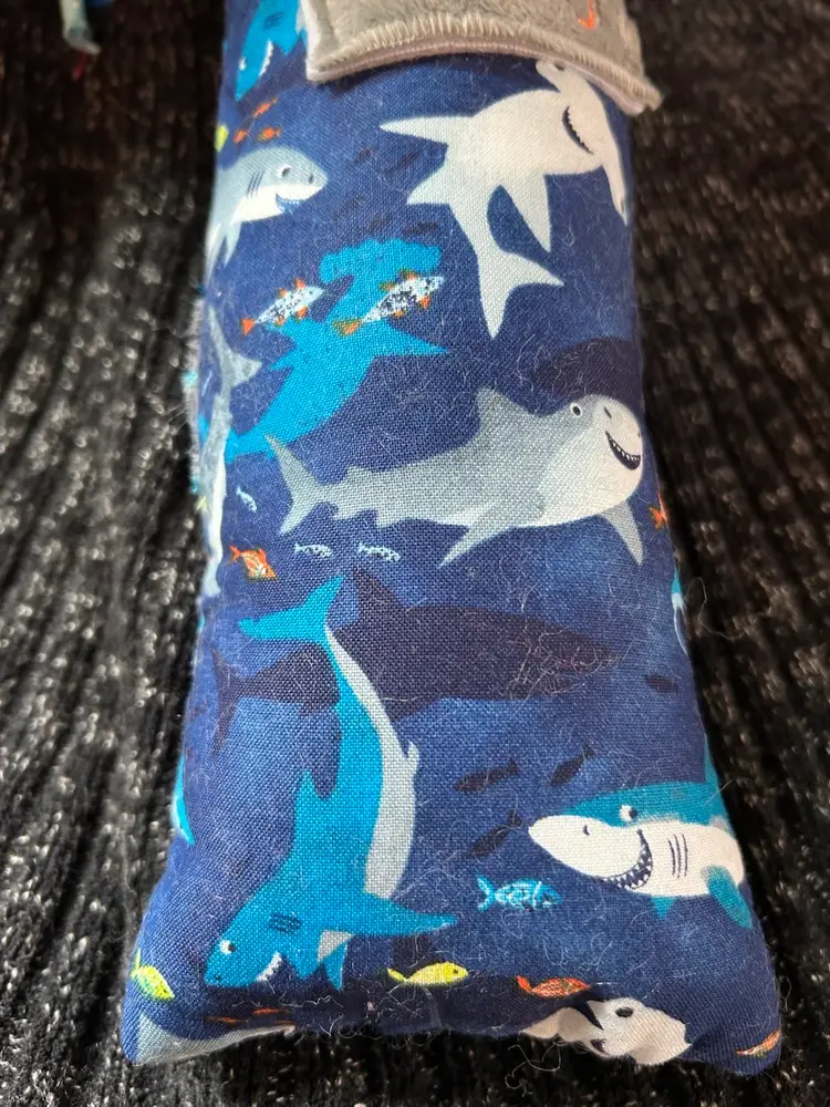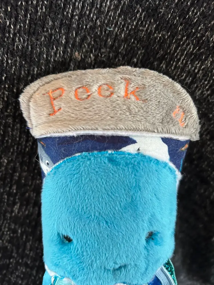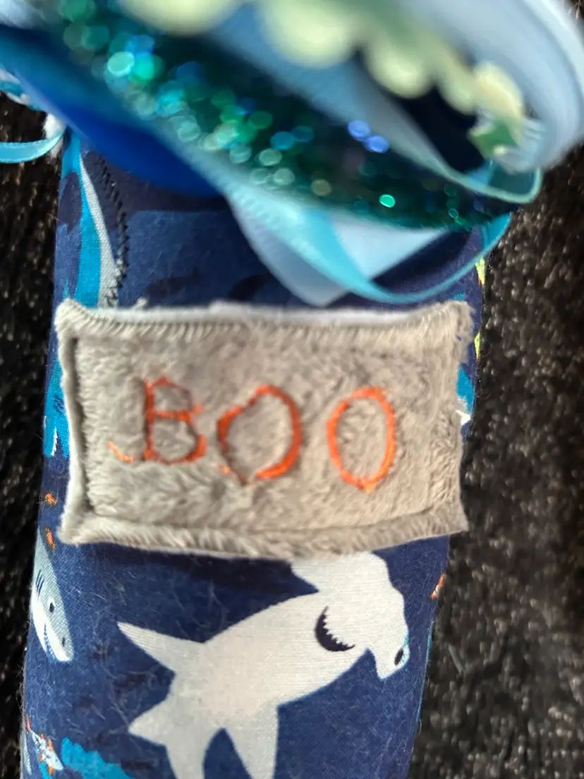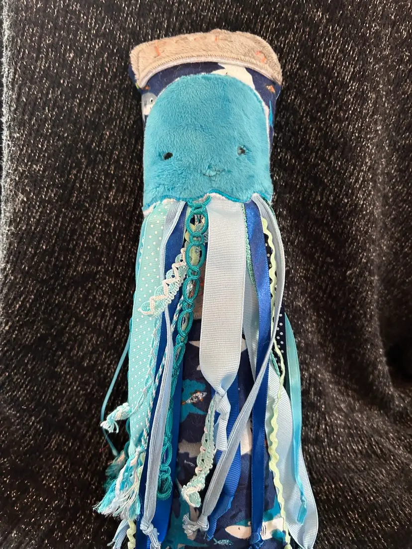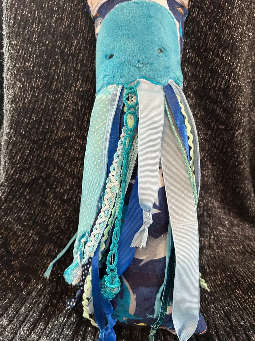 I used cotton shark fabric to make octopus. I embroidered “Peek A “ on top of octopus and lift the ribbon to uncover “Boo” i used coordinating ribbons perfect for little hands to grab. It is 14” long.