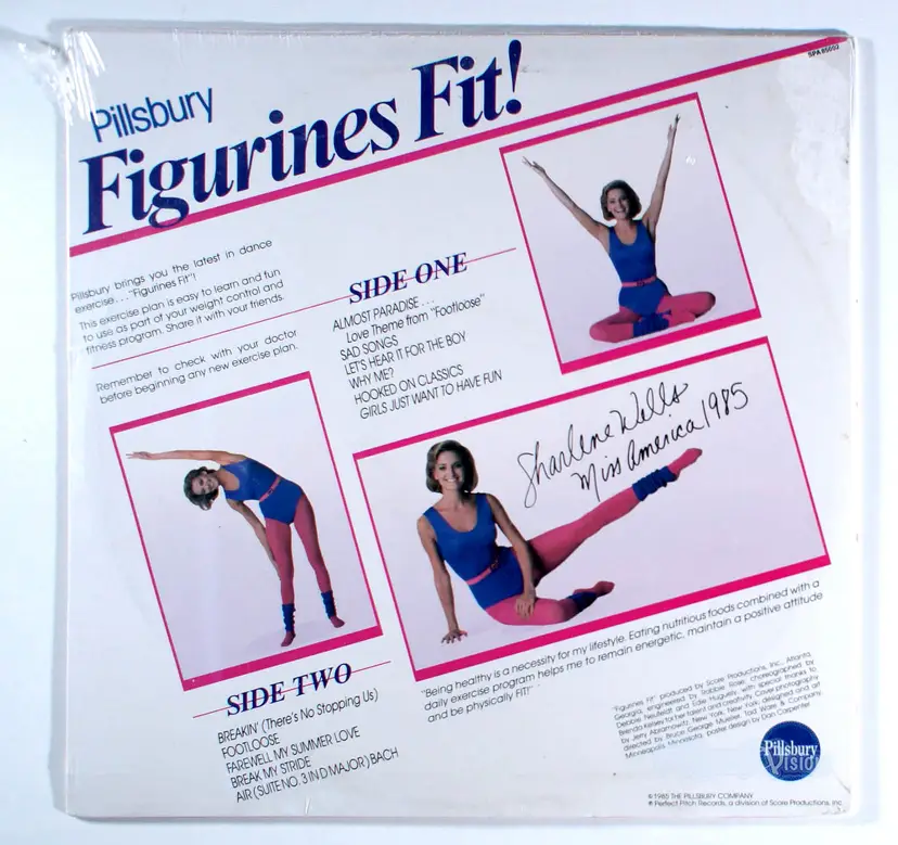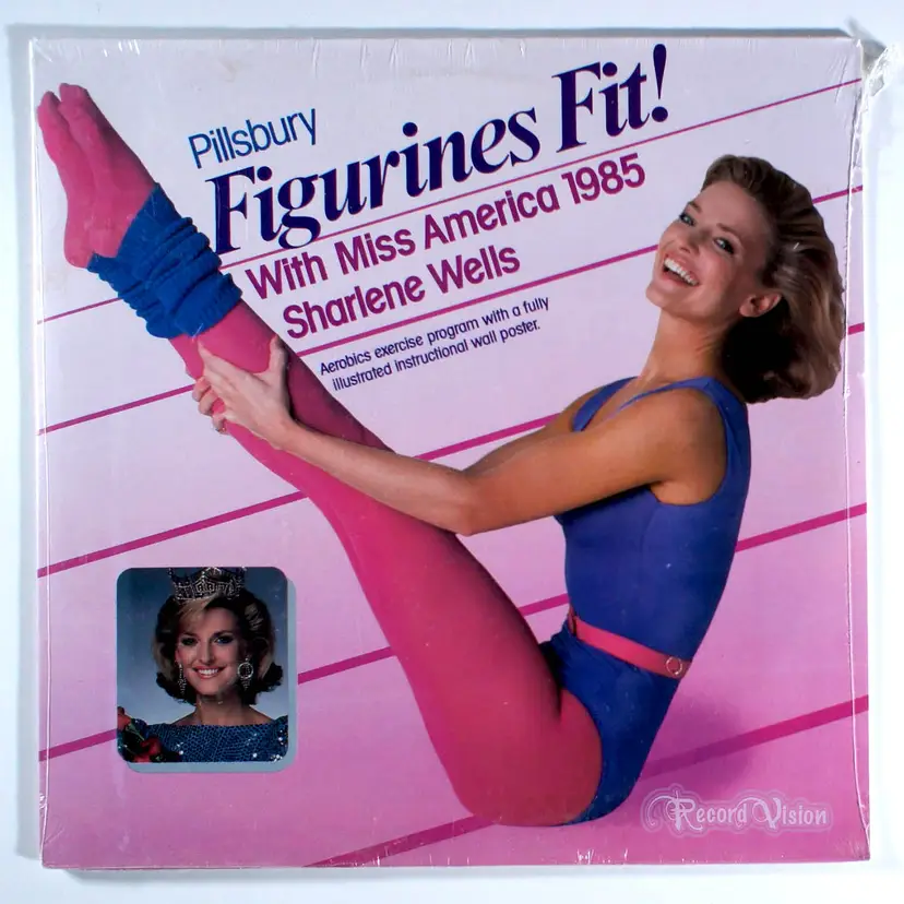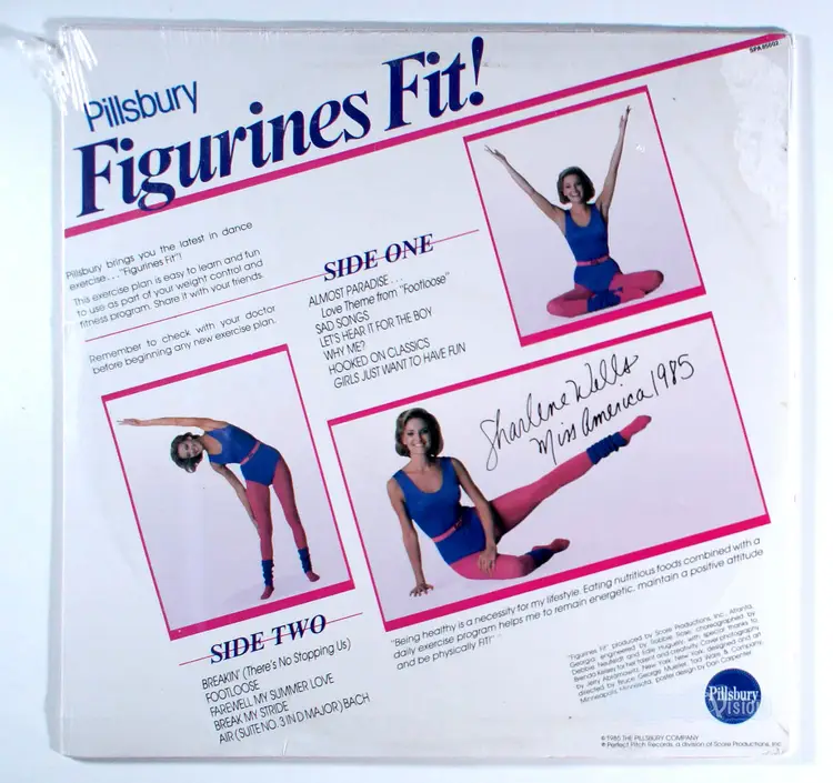 Pillsbury Figurines Fit With Miss America, by Sharlene Wells, is an aerobics exercise program with a fully illustrated instructional wall poster.