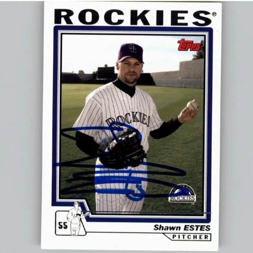 Authentic 2004 Topps baseball card featuring Shawn Estes of the Colorado Rockies, signed in bold blue Sharpie. A great addition for Rockies fans and autograph collectors. Your purchase supports Signatures For Soldiers in helping homeless and disabled veterans.