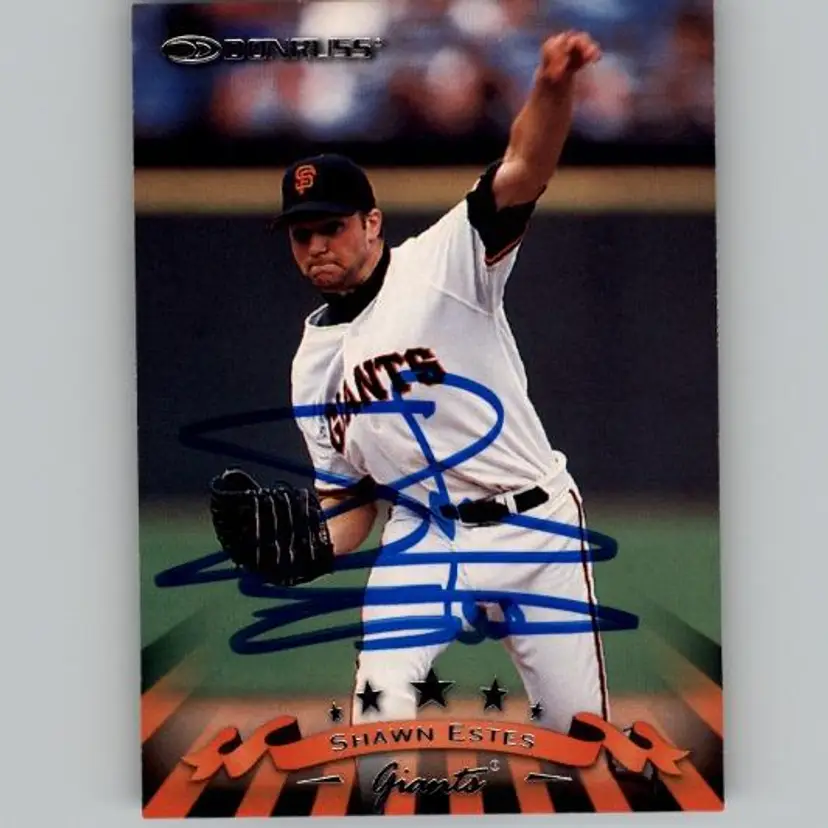 Authentic 1998 Donruss baseball card featuring Shawn Estes of the San Francisco Giants, signed boldly in blue Sharpie. A must-have for Giants fans and autograph collectors. Your purchase supports Signatures For Soldiers in aiding homeless and disabled veterans.