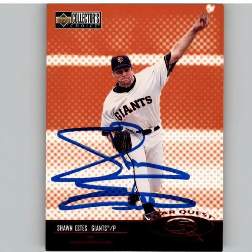 Authentic 1998 Collector's Choice baseball card featuring Shawn Estes of the San Francisco Giants, signed boldly in blue Sharpie. A great addition for Giants fans and autograph collectors. Your purchase supports Signatures For Soldiers in helping homeless and disabled veterans.
