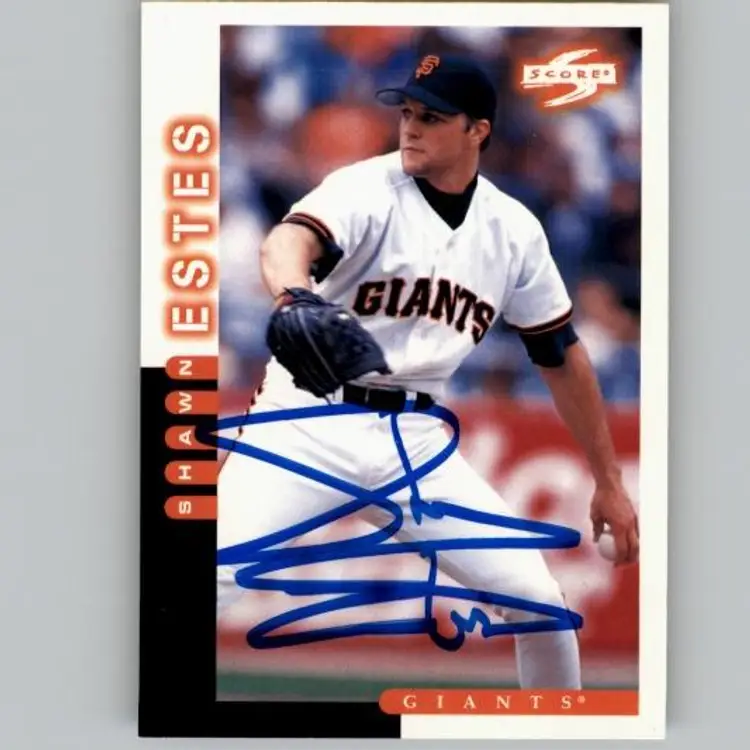 Authentic 1998 Score baseball card featuring Shawn Estes of the San Francisco Giants, signed boldly in blue Sharpie. A great addition for Giants fans and autograph collectors. Your purchase supports Signatures For Soldiers in helping homeless and disabled veterans.
