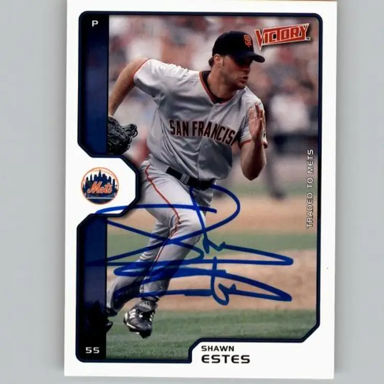 Authentic 2002 Upper Deck Victory baseball card featuring Shawn Estes of the San Francisco Giants, signed in bold blue Sharpie. A great addition for Giants fans and autograph collectors. Your purchase supports Signatures For Soldiers in helping homeless and disabled veterans.