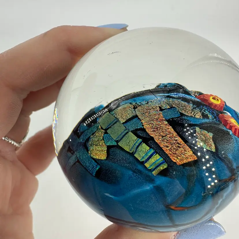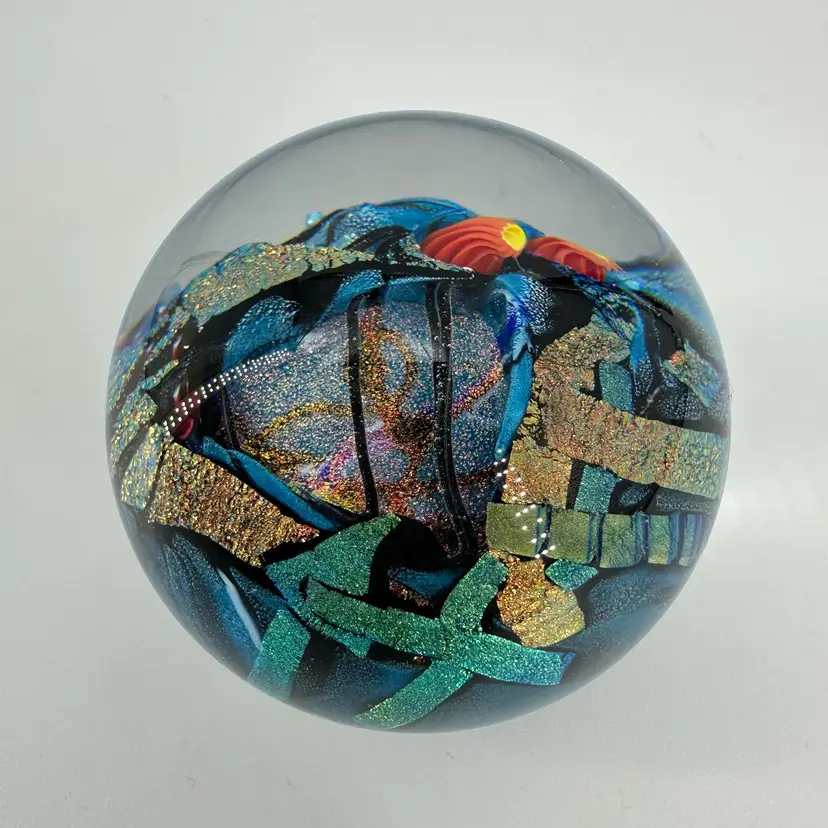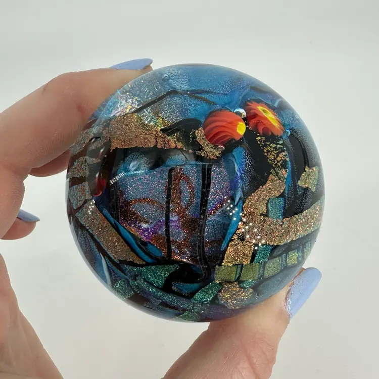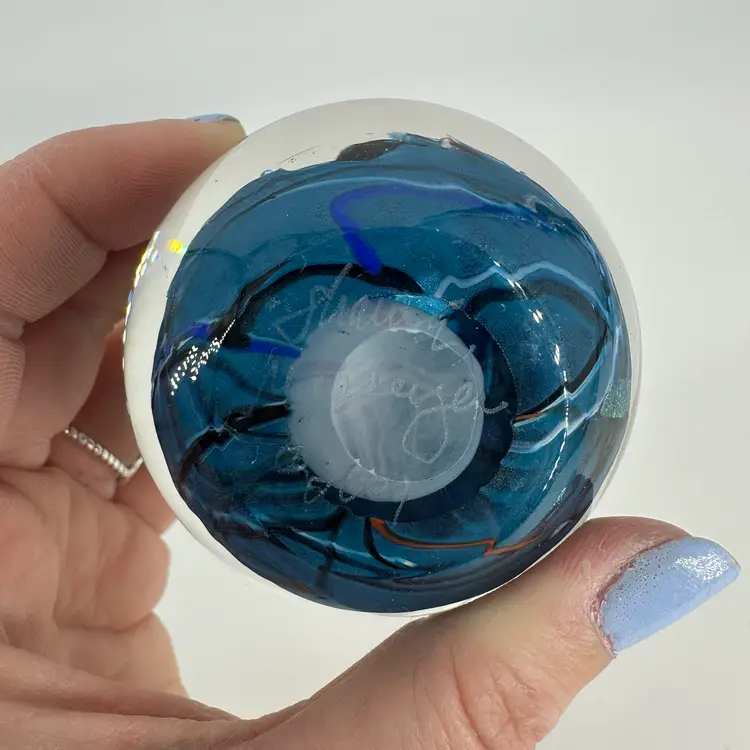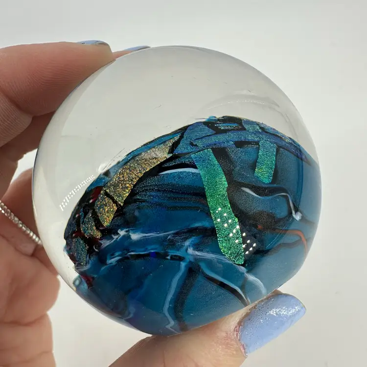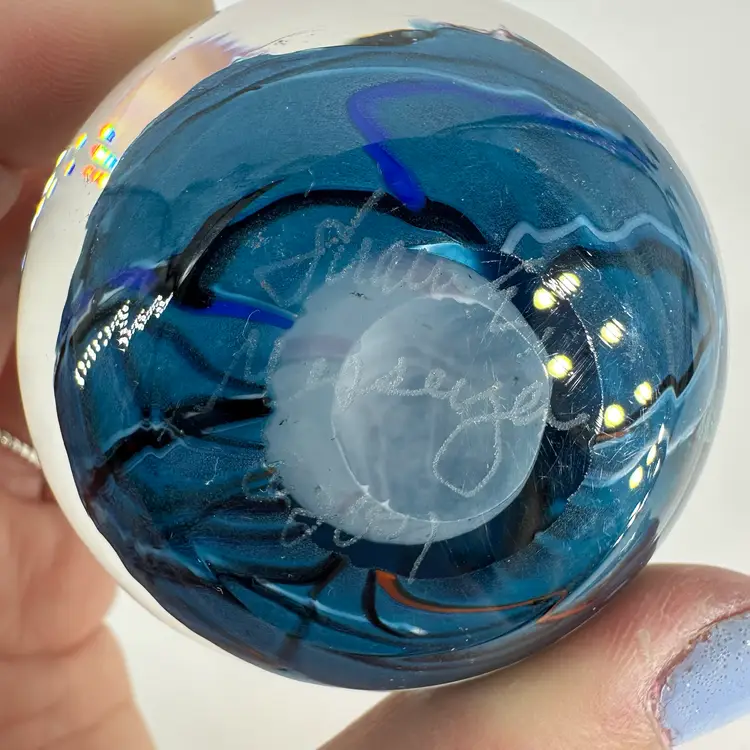 Shawn Messenger clear art glass paperweight featuring black and blue/green dichroic foil designs, as well as pulled orange millefiori flower. Engraved “Shawn Messenger 2001” signature on bottom. Measures approximately 2.5” tall and 2.25” wide. No chips or cracks. Slight scratch marks, see photos.