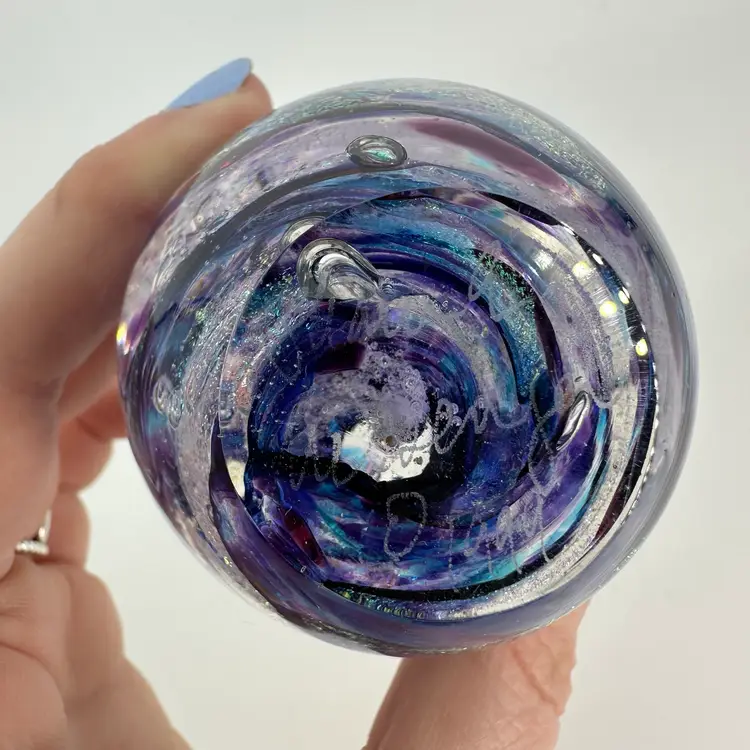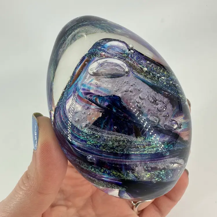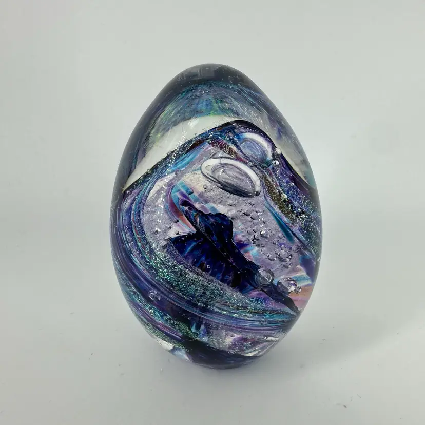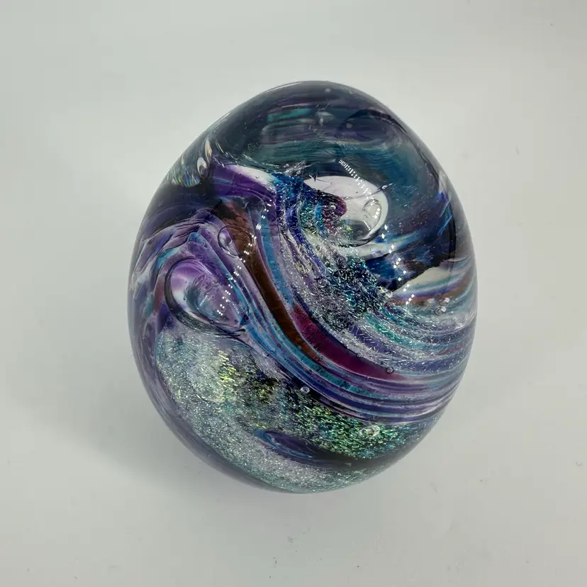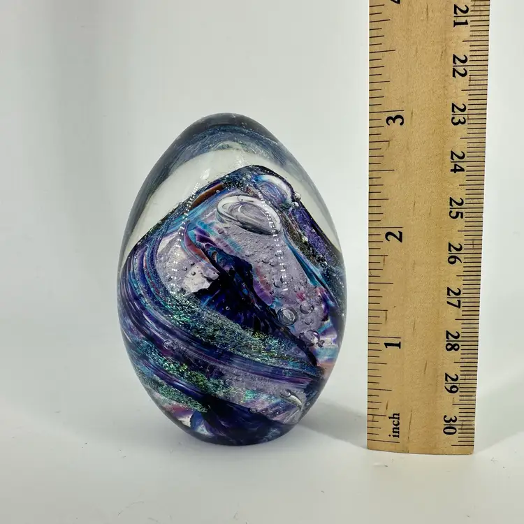 Clear art glass egg shaped paperweight featuring a purple/blue swirl design with glitter. Etched signature on base “Shawn Messenger 1999”. No chips or cracks. Measures approximately 3.5” tall.