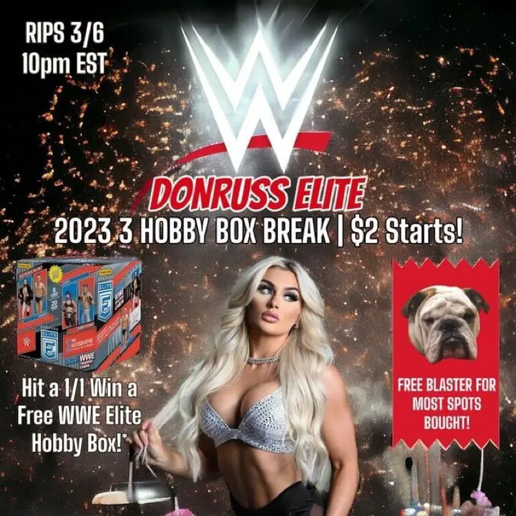 You are bidding the cards of the WRESTLER listed in the title in this 3x Hobby Box rip of WWE Donruss Elite 2023 wrestling cards. All 3 Boxes will be opened LIVE after auctions end on Wednesday, 3/6/2024, at apx 10 PM Eastern / 7 PM Pacific. Opening will be viewable & simulcast on the Schway Nostalgia District as well as on Twitter, X/Twitch, YouTube and our Facebook Group! US Shipping: $4.50 for 1st spot won; only $.25 for any subsequent spots you win. Any spot won where no cards of the wrestler are found in the box will receive a wrestling card from my personal collection. Any dual, multi-wrestler, or other Wild Card pulled that does not apply to a wrestler spot listed will be assigned by draw between all participants. Base is randomized. Free Hobby box to 1st person who hits a 1/1 and a free blaster for most spots bought!
