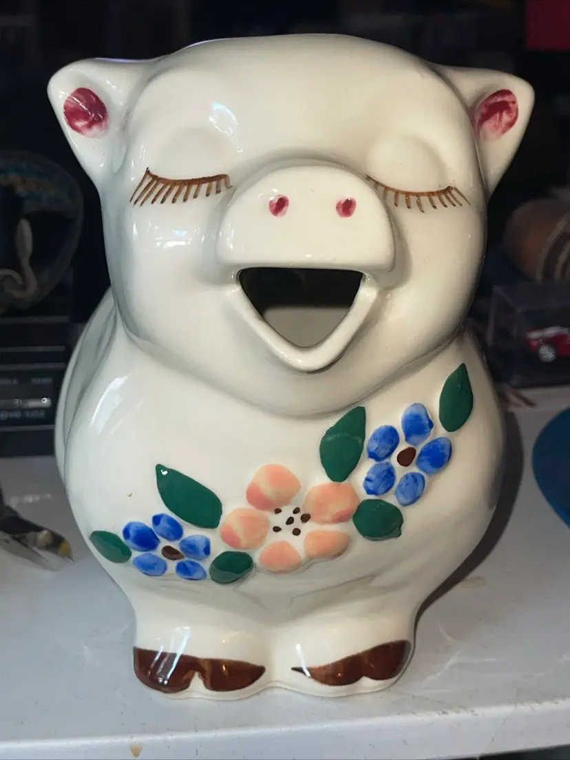 This Shawnee Smiley Pig milk pitcher is a vintage original product made in the United States. It stands 7.5 inches tall and is white porcelain with impressed backstamp and hand-painted peach and blue flower themes.
