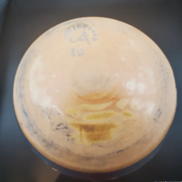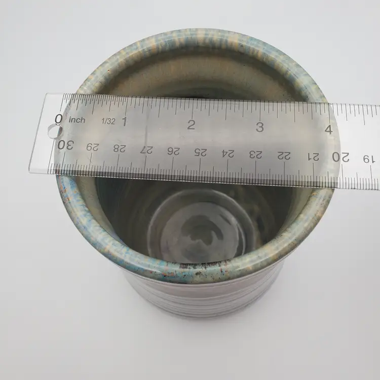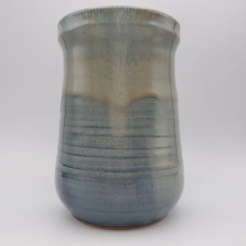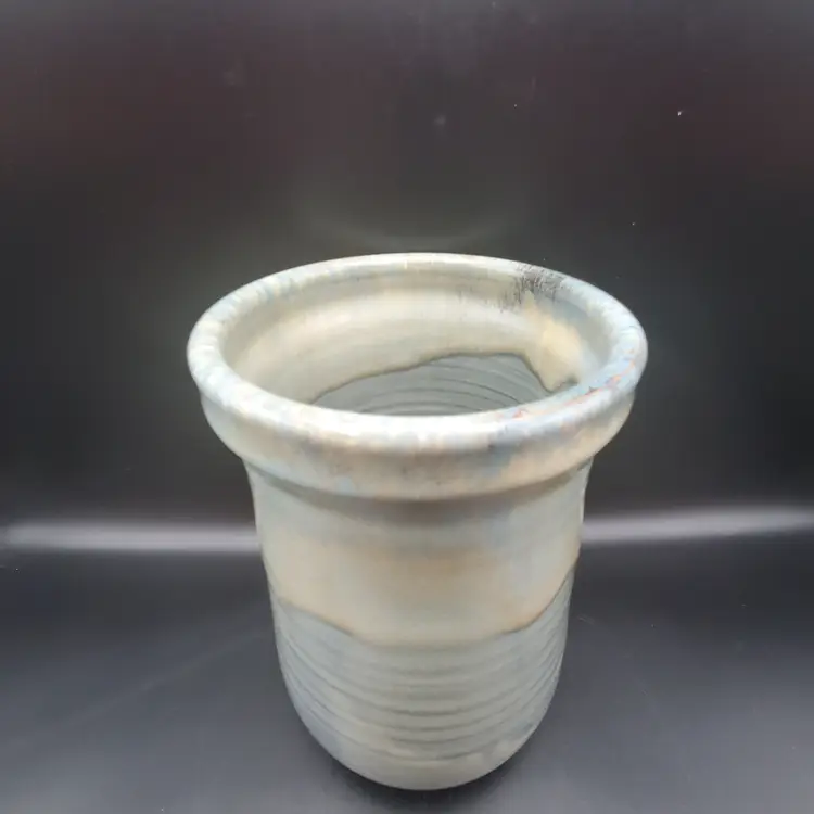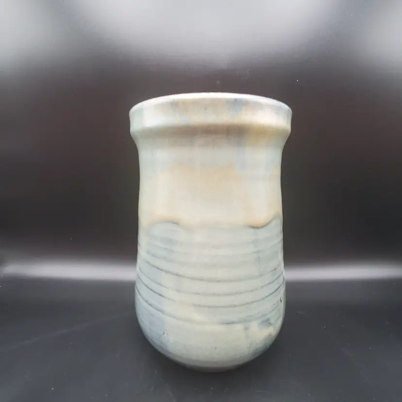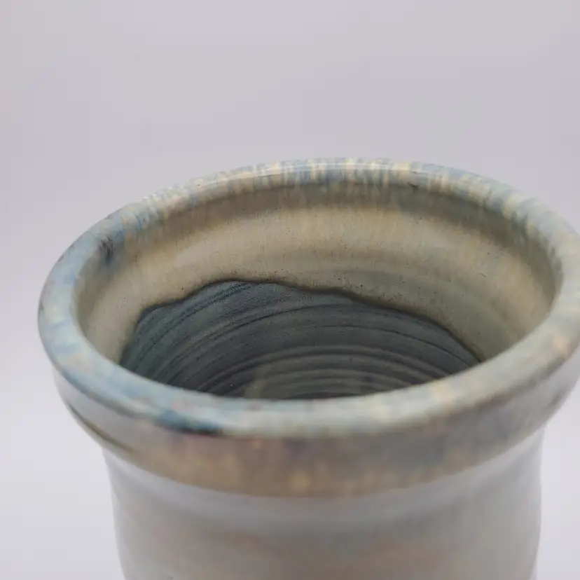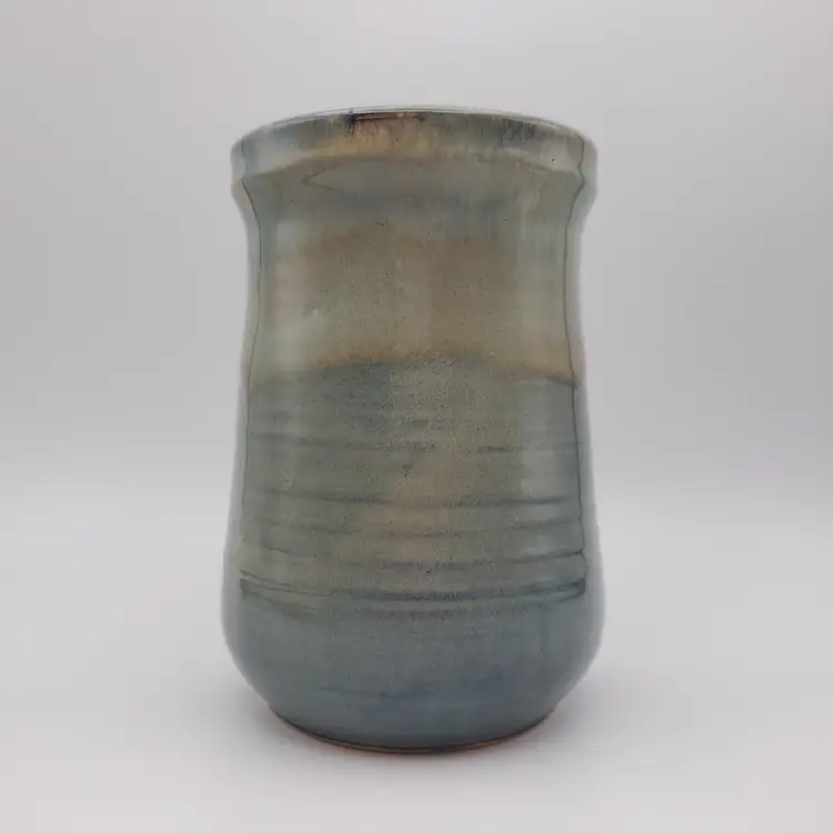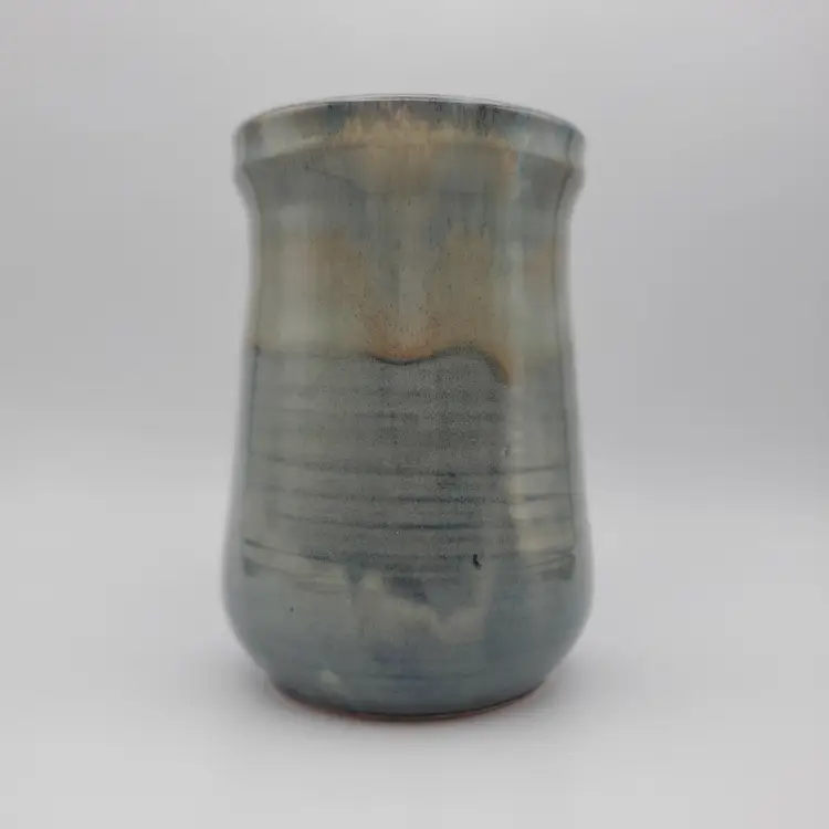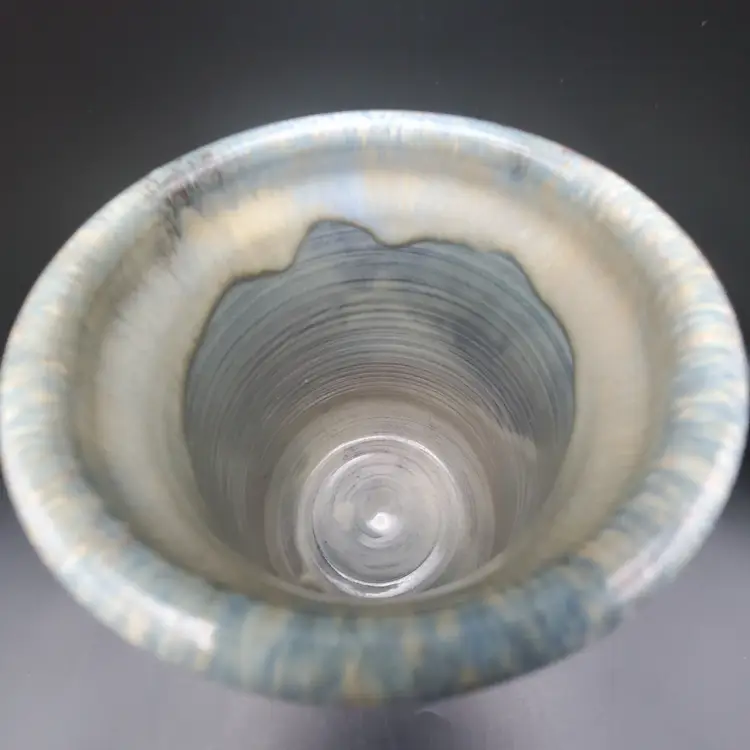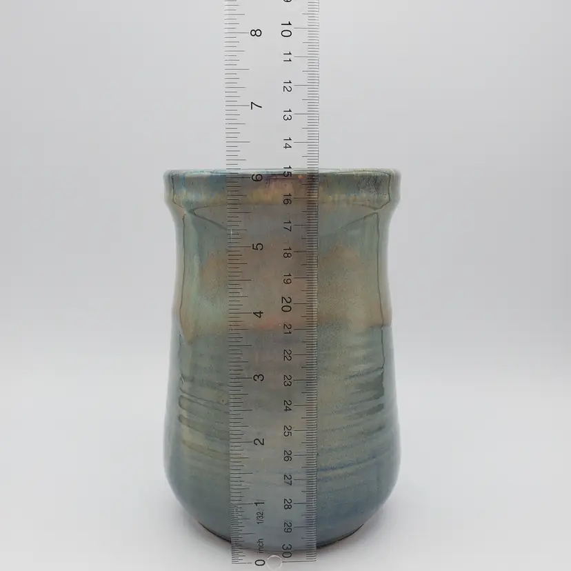 The Shearwater Pottery vase by James (Jim)Anderson from 2010 features a beautiful blue drip glaze. This vase stands approximately 6 inches tall and is approximately 4 inches wide and weights 1.80 lbs. It is signed by the artist, showcasing the craftsmanship and creativity of James Anderson and Shearwater Pottery of Ocean Springs, Mississippi