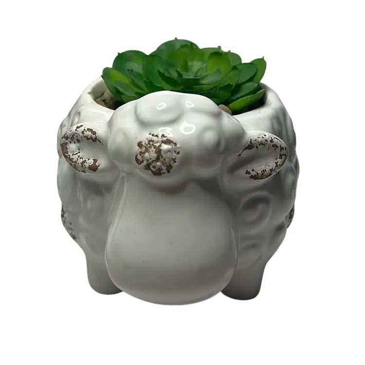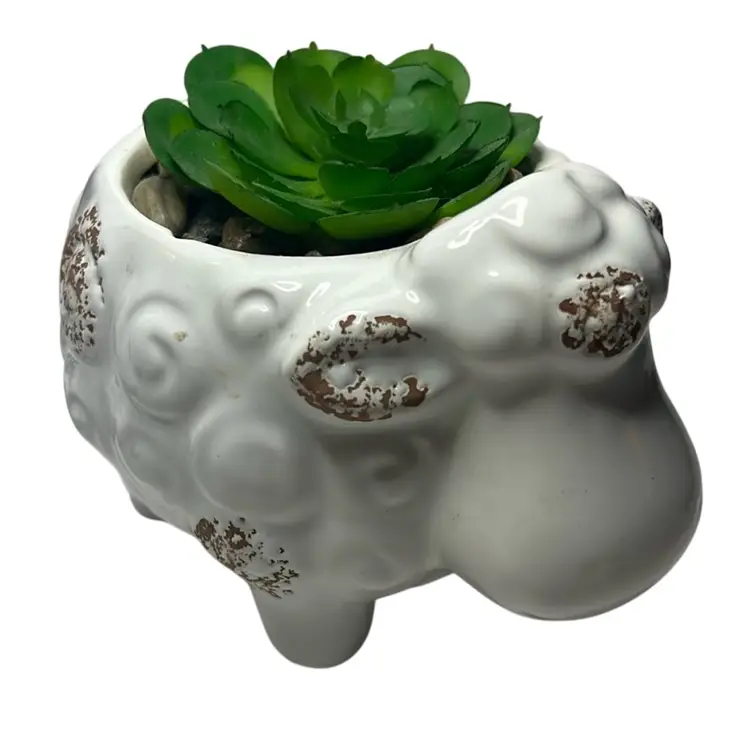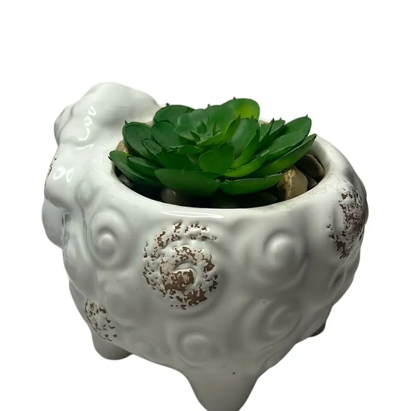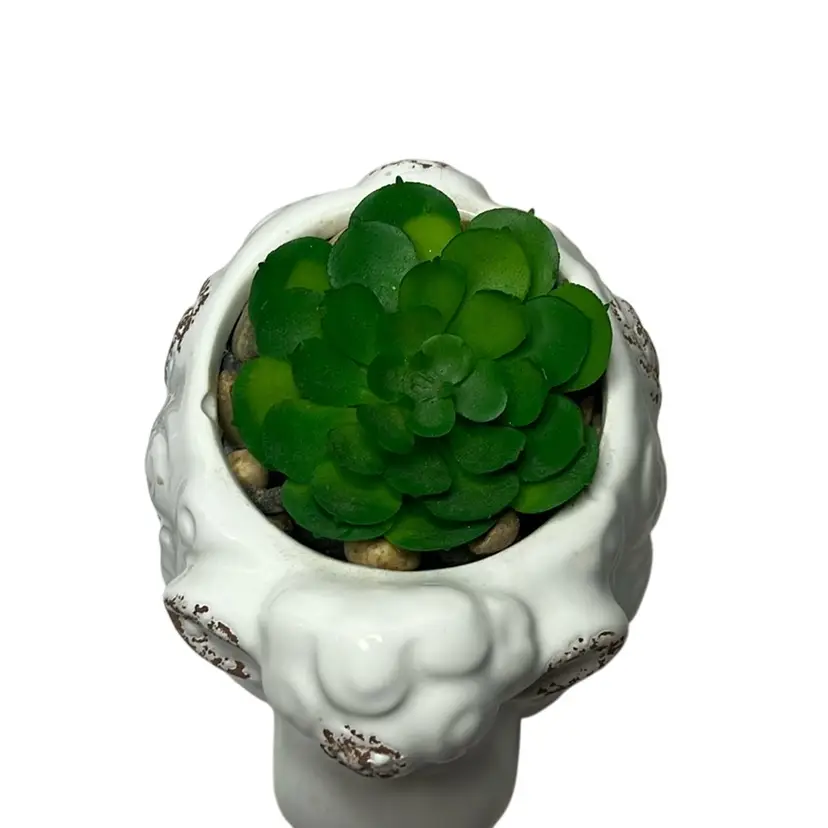 Has rocks under succulent and they all seem glued in. No damage, really adorable. Measures 3.5” tall & 4” wide
