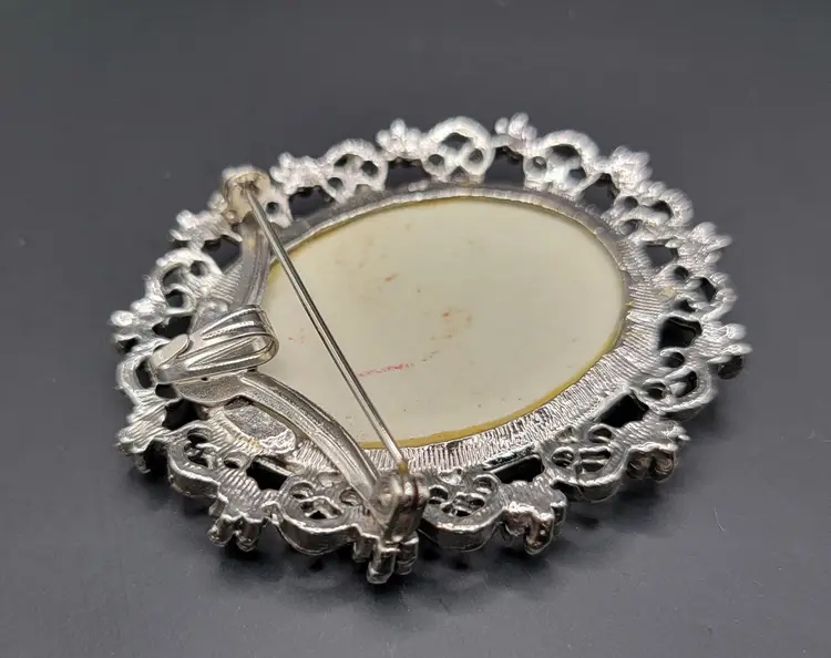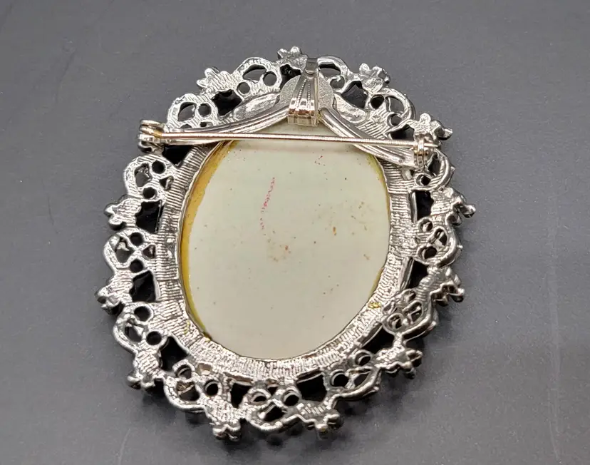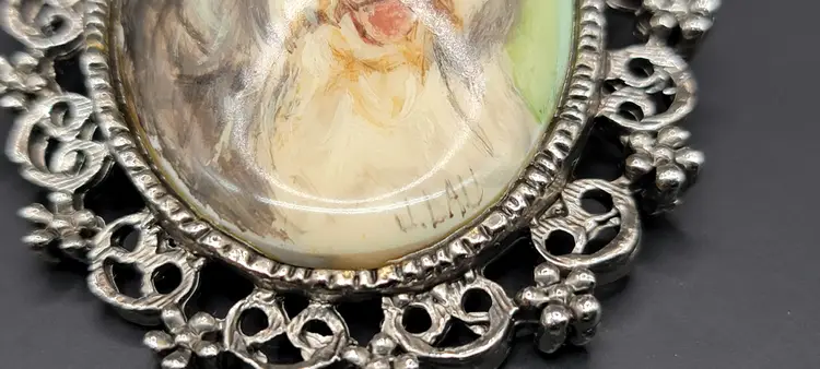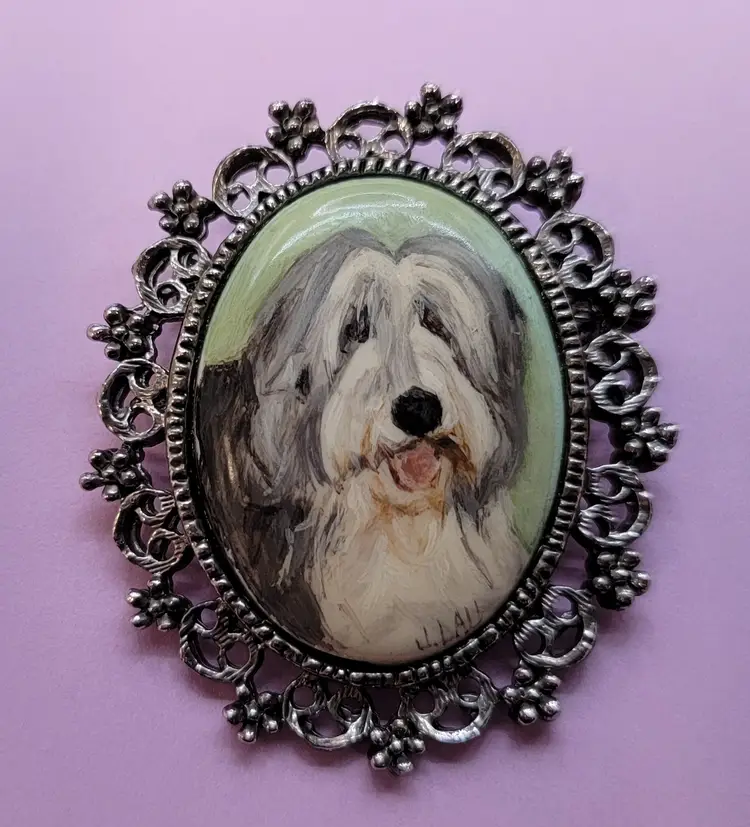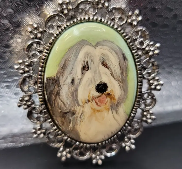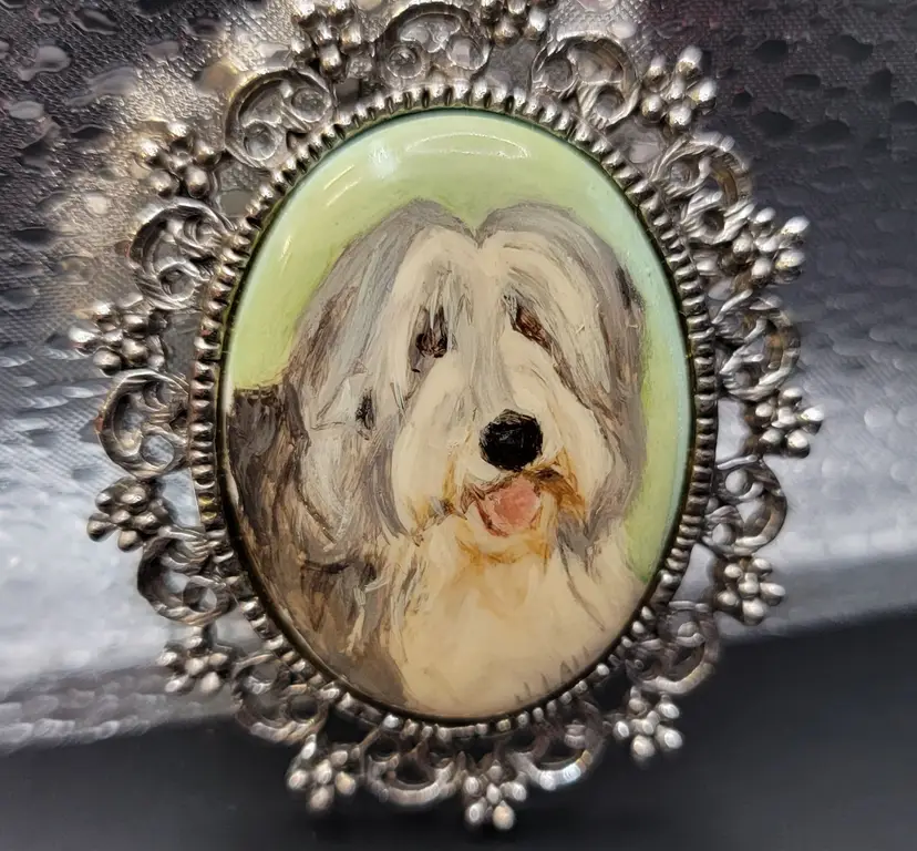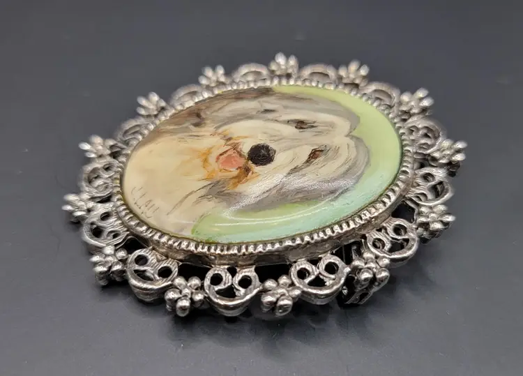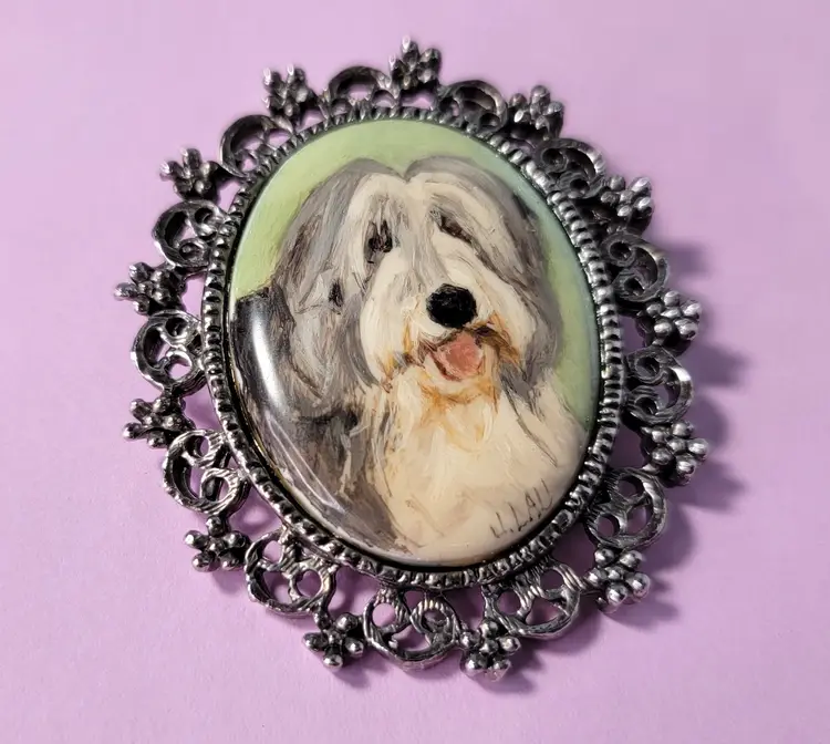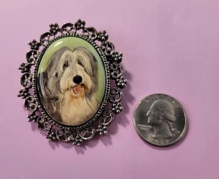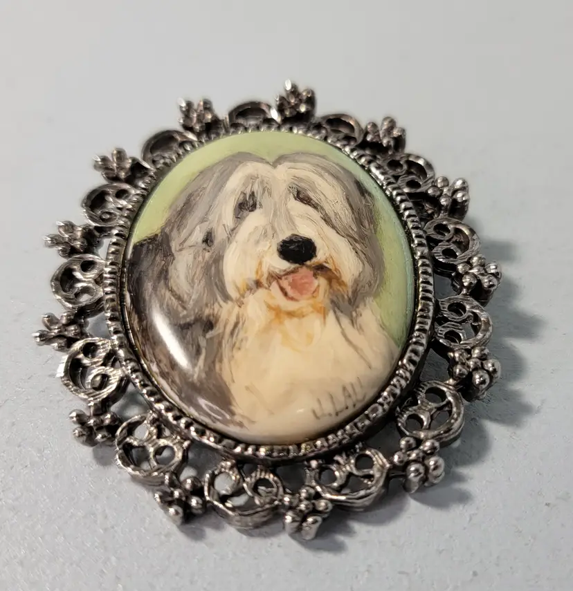Cute vintage sheepdog brooch can also be worn as a pendent, with pin on back as well as hoop. The artist of the sheepdog is J. Lau This costume jewelry brooch is just fun. 2 inches tall, 2 inches wide, nice dark silver tone metal. In great used vintage condition, with a tiny red scuff mark on ceramic back.