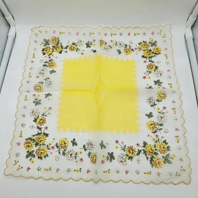 Beautiful sheer handkerchief in yellow w/yellow floral scalloped boarder. Condition: pre-owned; no stains/rips/tears; see photos. SKU: Linens-1