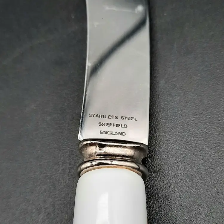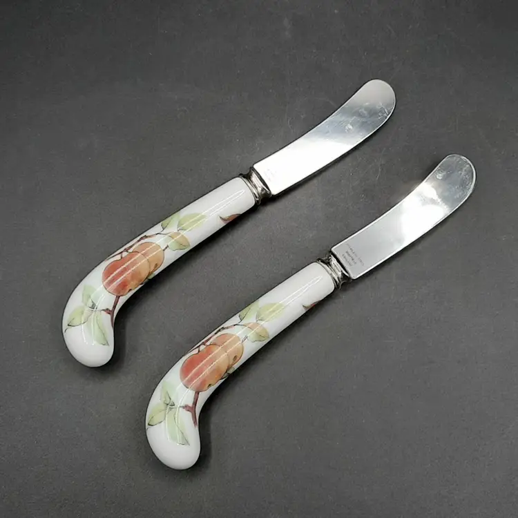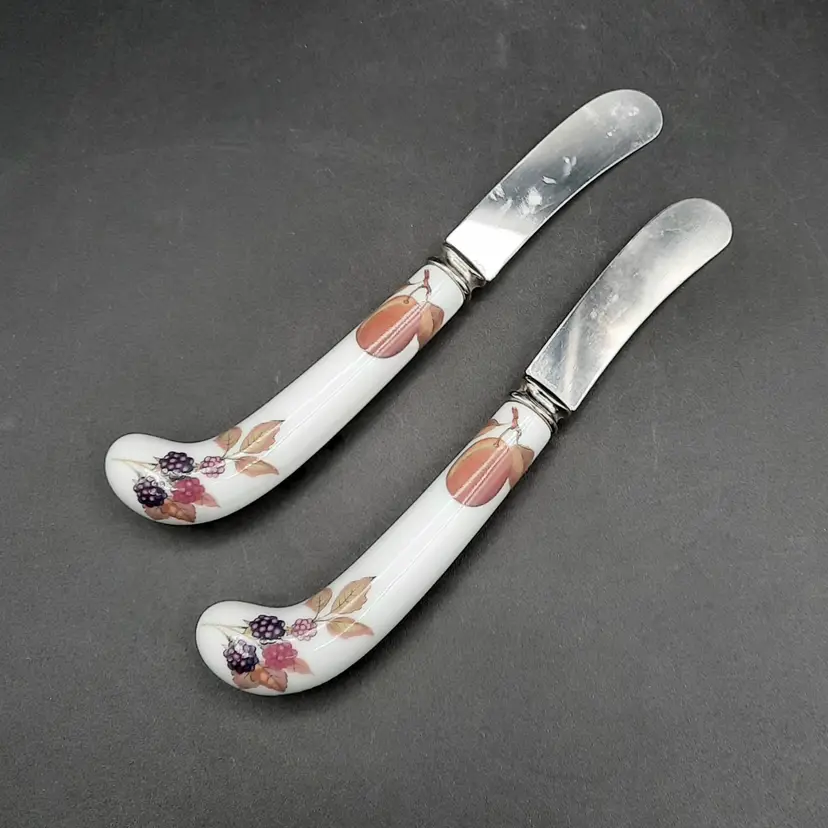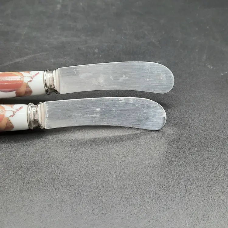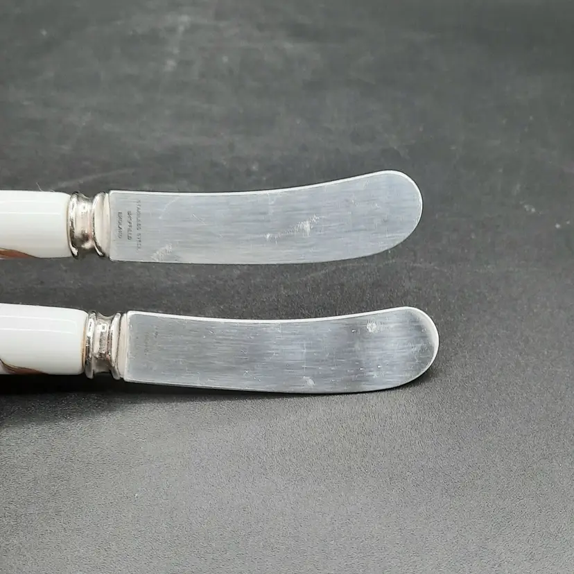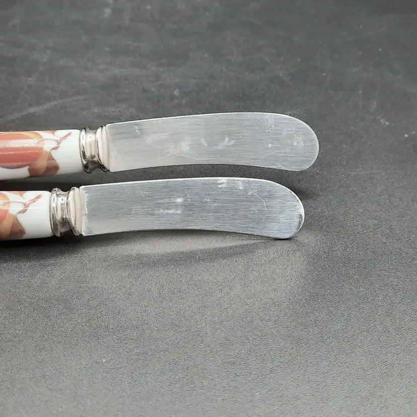 These pretty little spreaders are 6 3/4", handles are in great condition, there is wear and scuffing to stainless blades