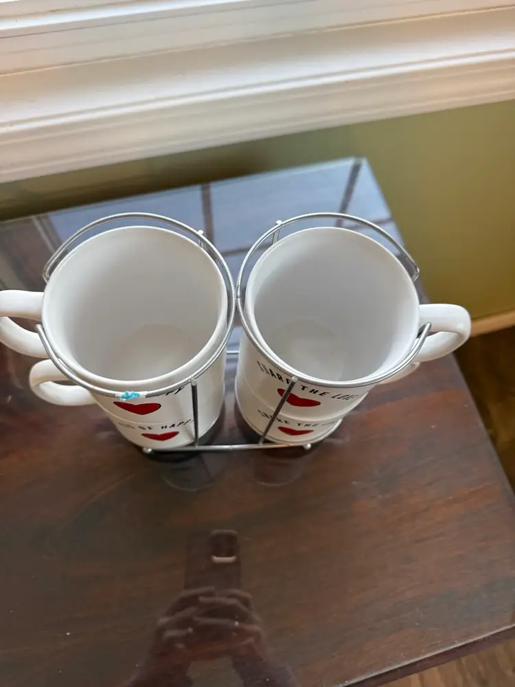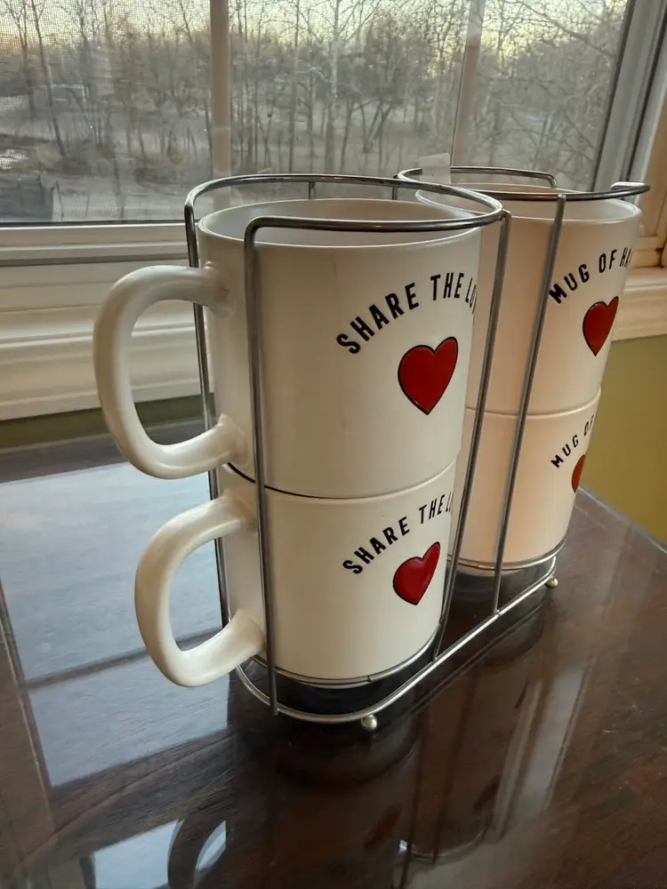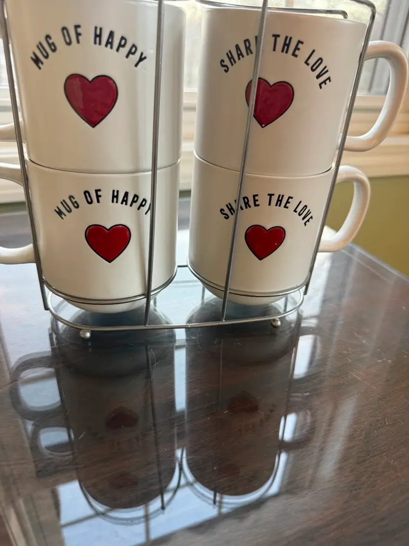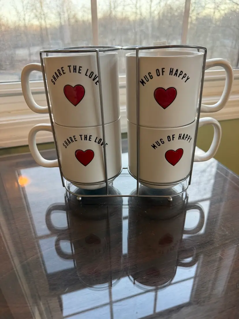 The Sheffield Home Share The Love Mug set includes four 16oz ceramic mugs, perfect for enjoying hot or cold beverages on Valentine's Day. Each mug features a painted heart design in white, red, and black, adding a touch of love and happiness to your kitchen or dining area. These round mugs are dishwasher and microwave safe, making them convenient and easy to use. The stackable design and decorated handles make them a charming gift for teens, boys, girls, and unisex adults and kids alike. Made from high-quality ceramic and pottery, these mugs are a delightful addition to your collectibles or dinnerware collection.