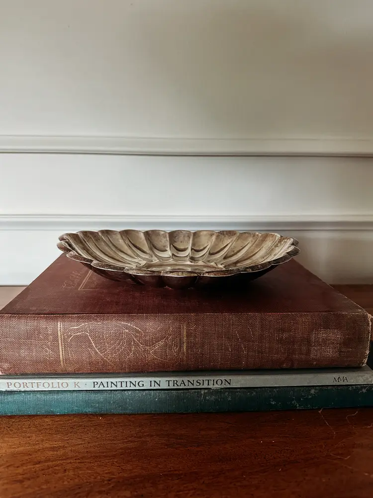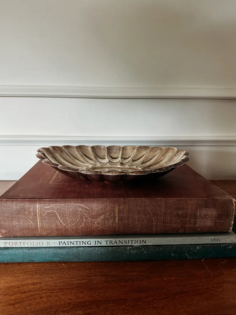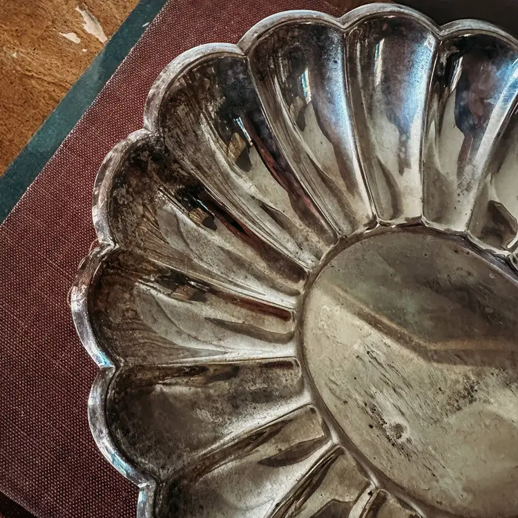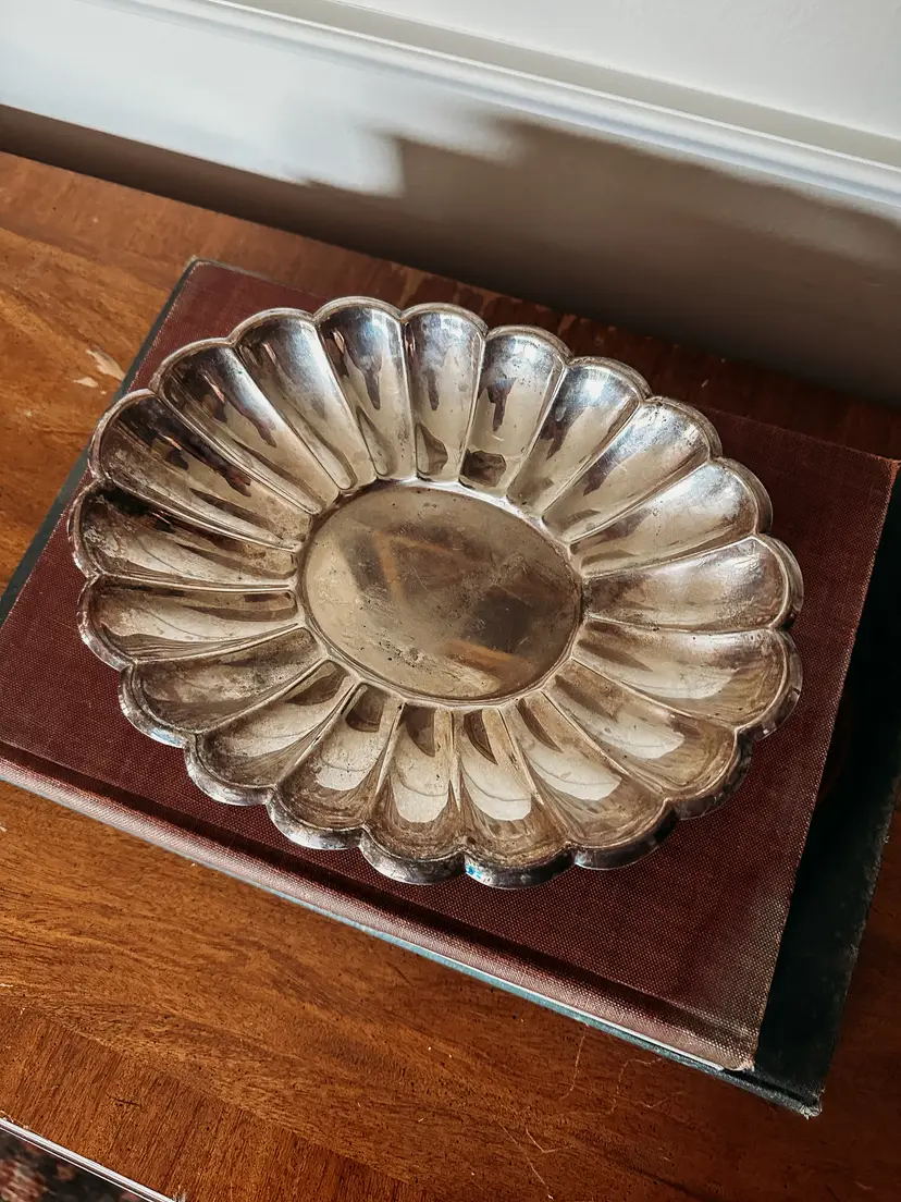 Shallow silver plate bowl with a scalloped design. Resembles a flower! Made by H.E. Sheffield Silver and made in the USA. Some tarnish, but could be polished if desired