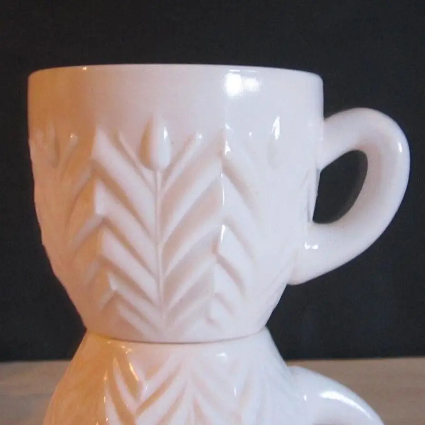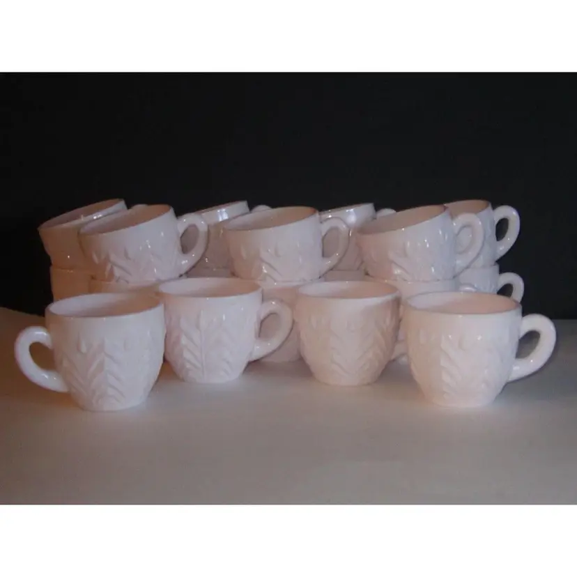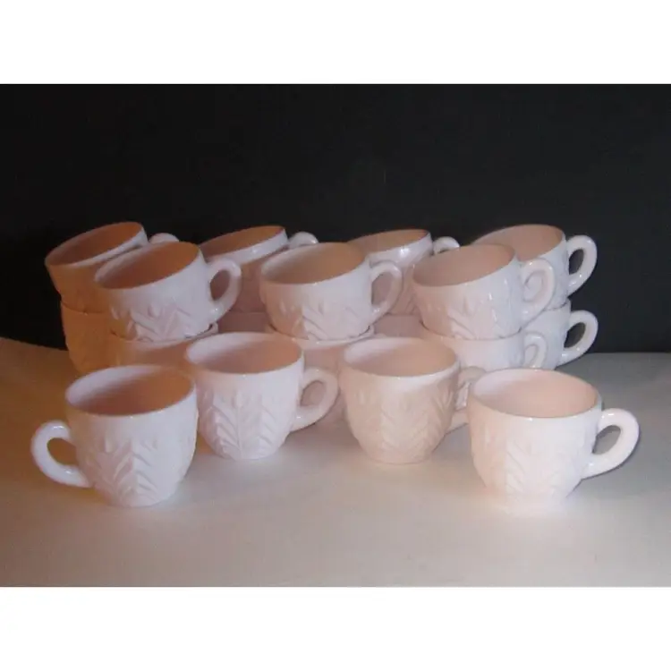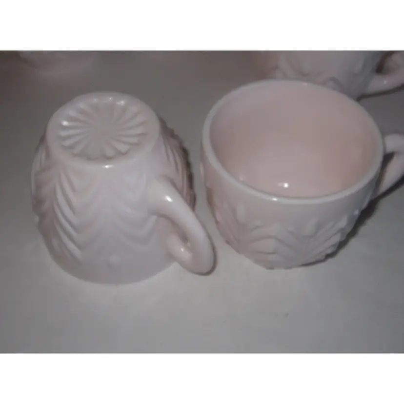 These are replacement punch cups, in FEATHER, PINK SHELL, Milk Glass, by Jeannette Glass. They are being sold in pairs of 2! They each measure, 2.5" high and is 4.75" wide with handles. * They are in great condition! Please see all pics, as they are part of the description.