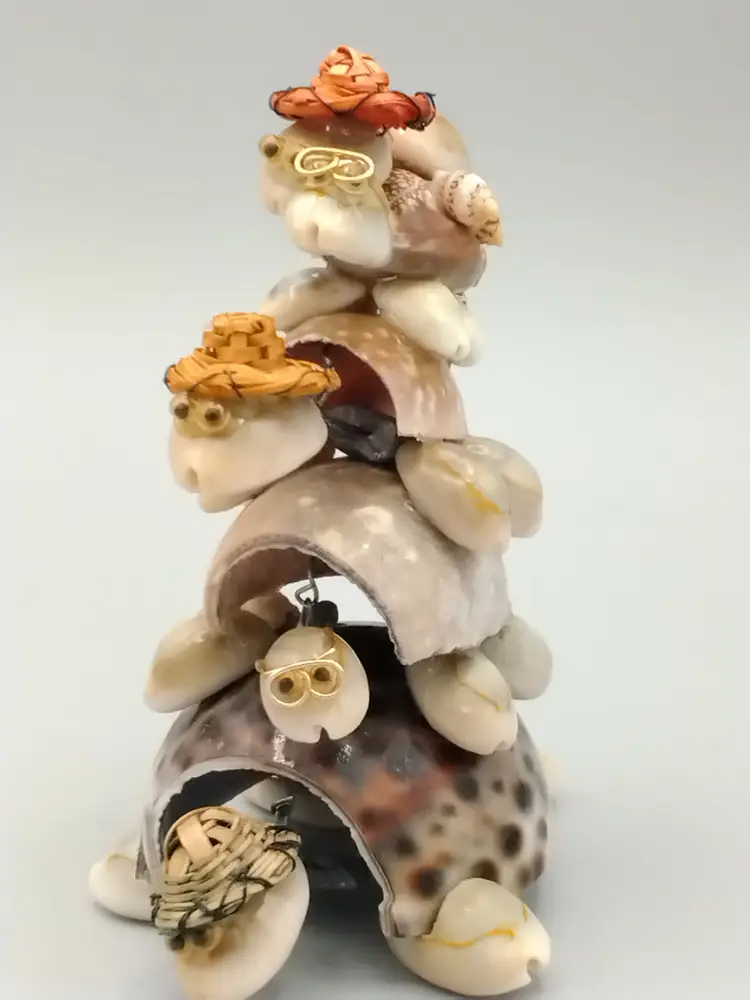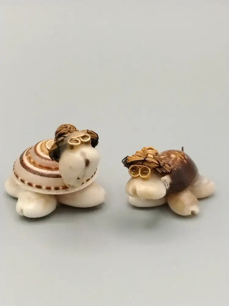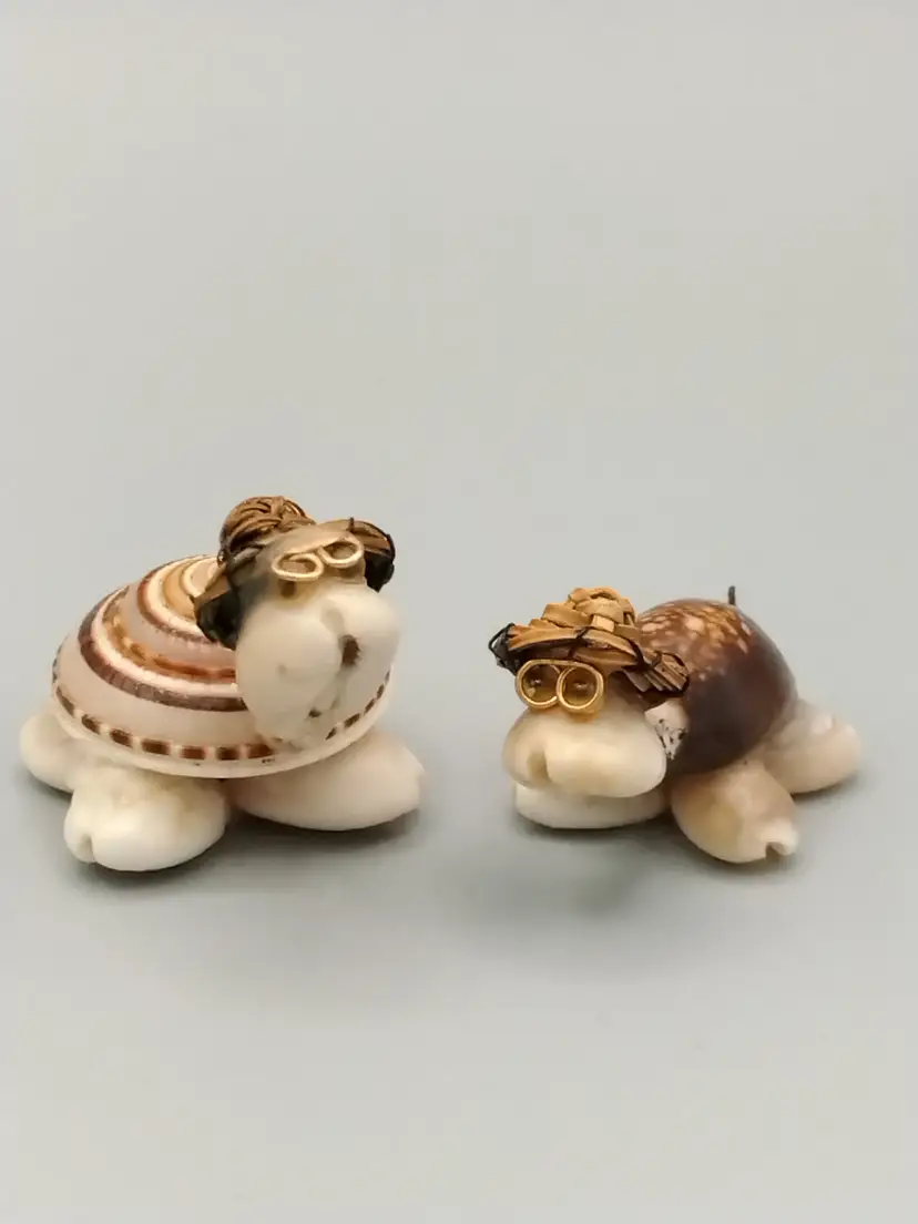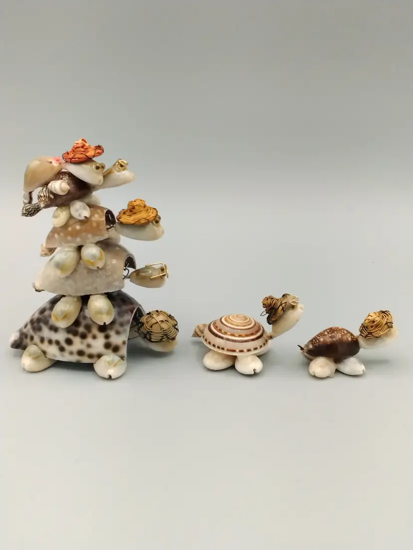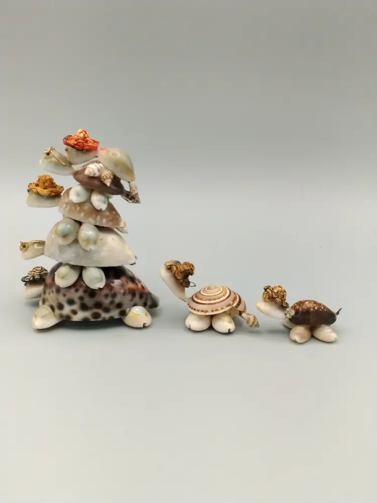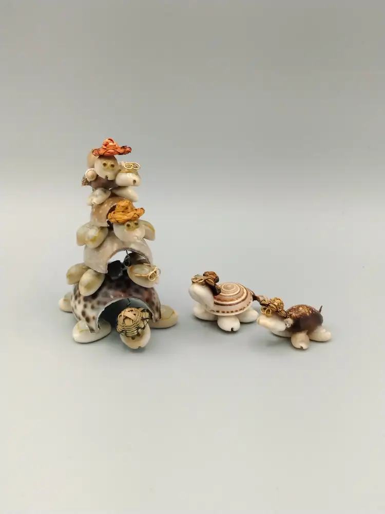 Shell turtle souvenir giftables made in the Philippines. A total of seven tutles dressed in hats and glasses. Five of them are in a stack, on each other's backs, two stand allone. Three of the larger Turtles in the stack are bobbleheads. A sticker located on the bottom largest turtle says "Made in the Philippines"