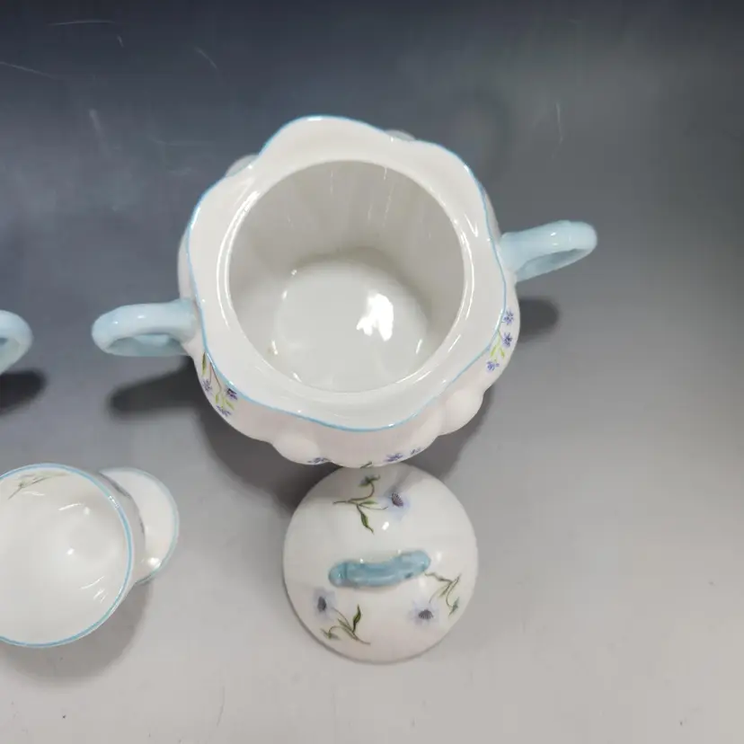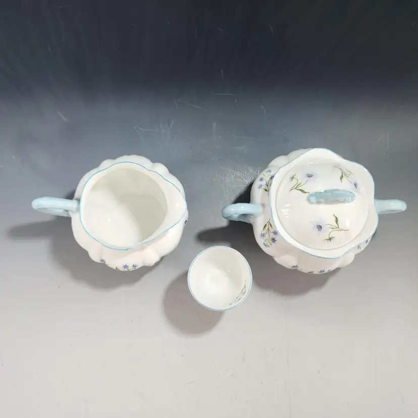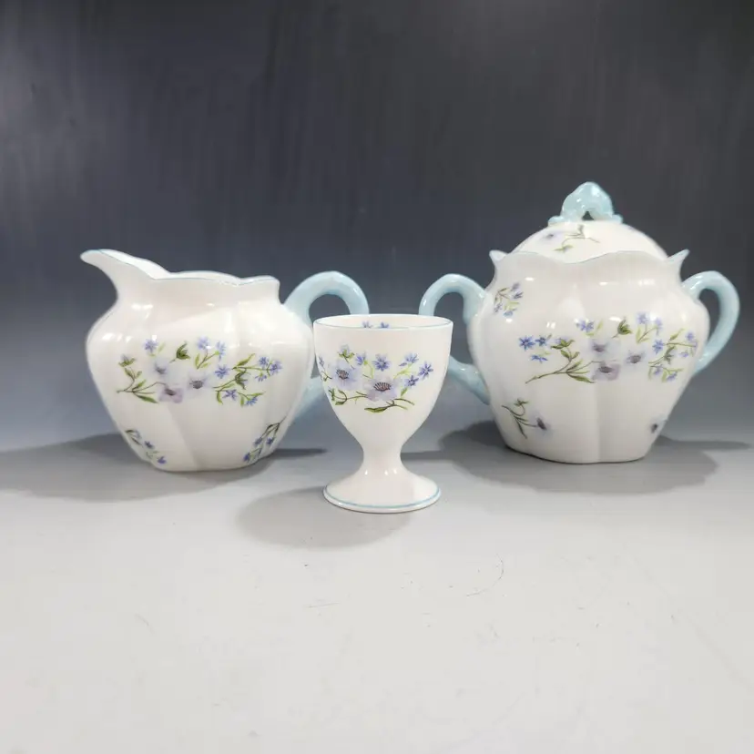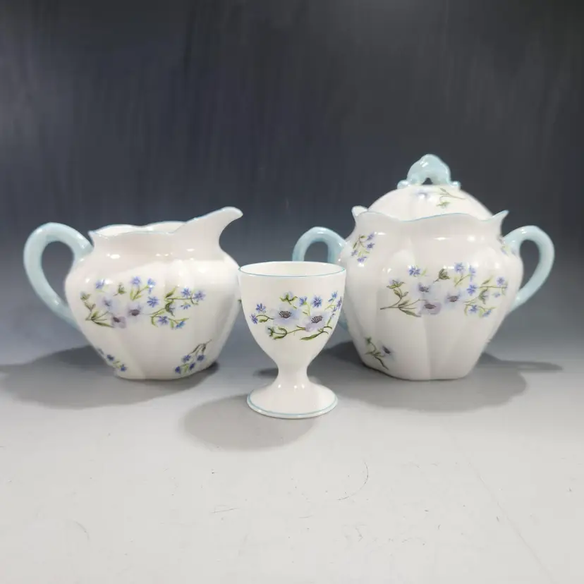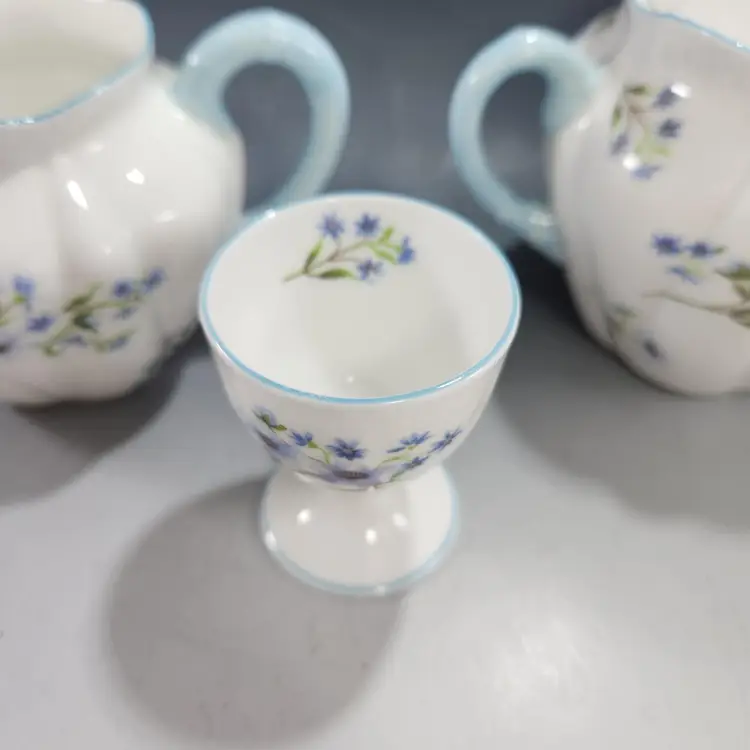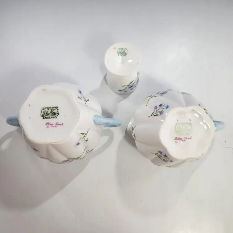 Mint Shelley Blue Rock floral pattern. This set includes a very hard to find covered sugar and creamer in the dainty shape with a matching egg cup. Fine English bone china, the creamer & sugar mark is 1925 - 45 and the egg cup is circa 1945 - 66. The pattern number is 13591