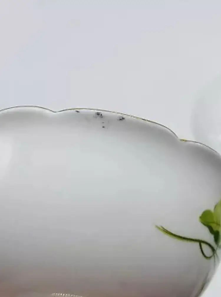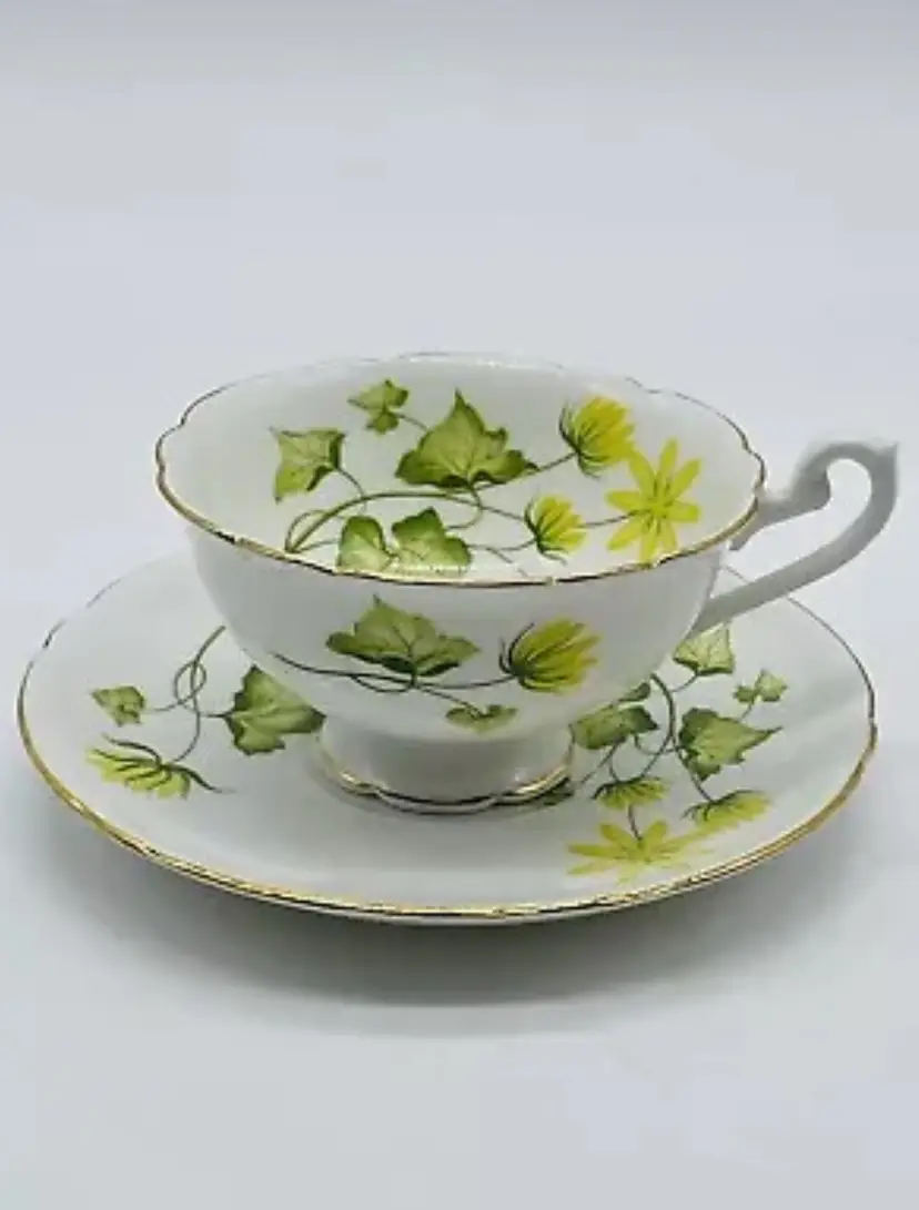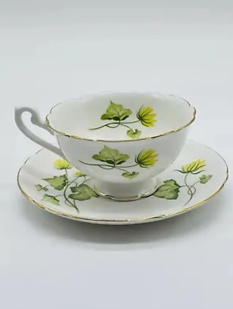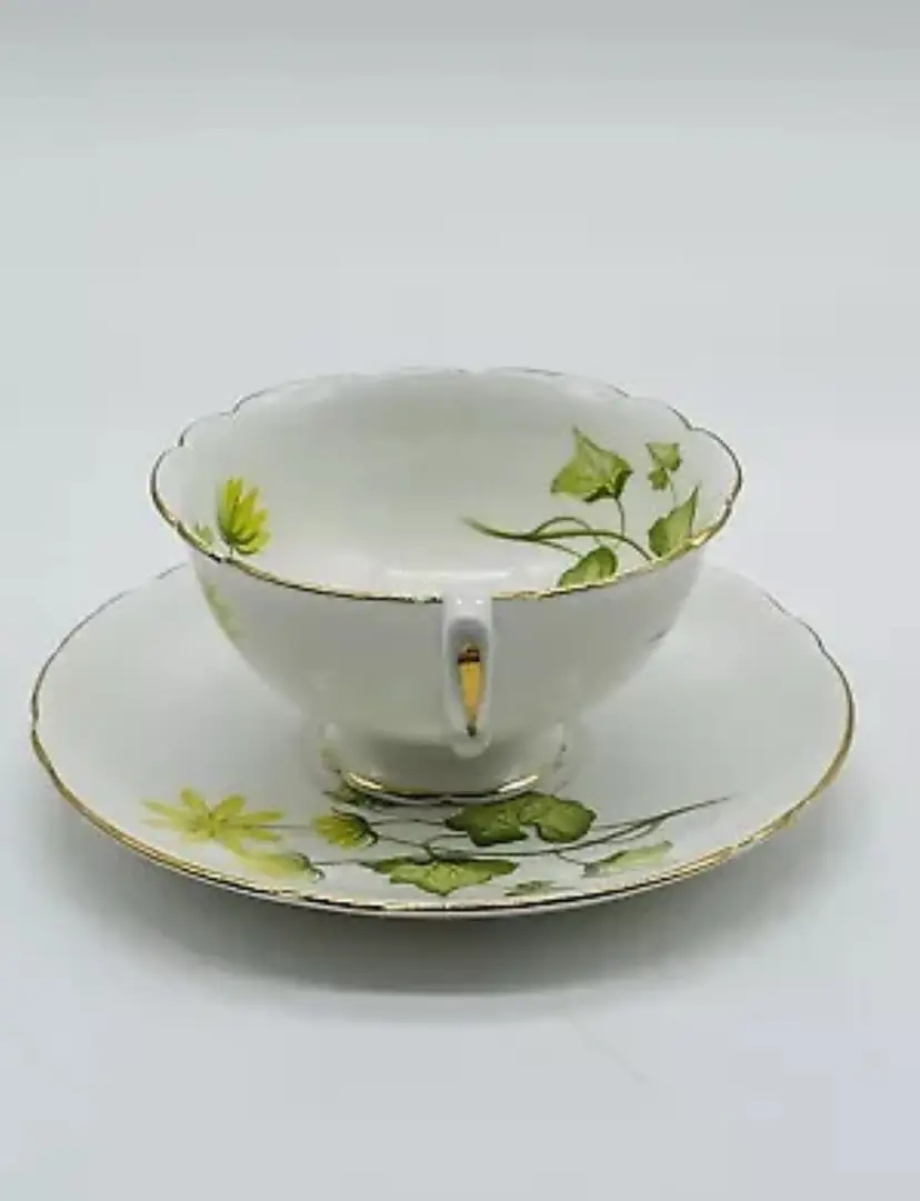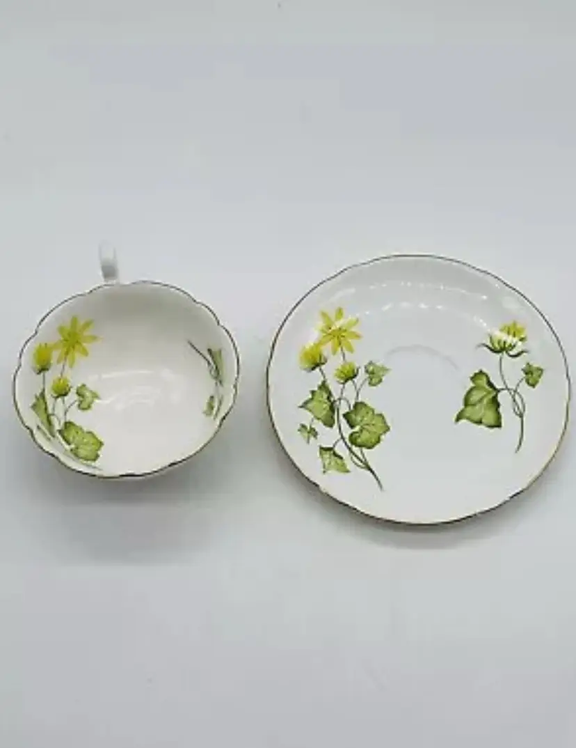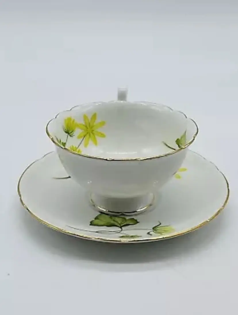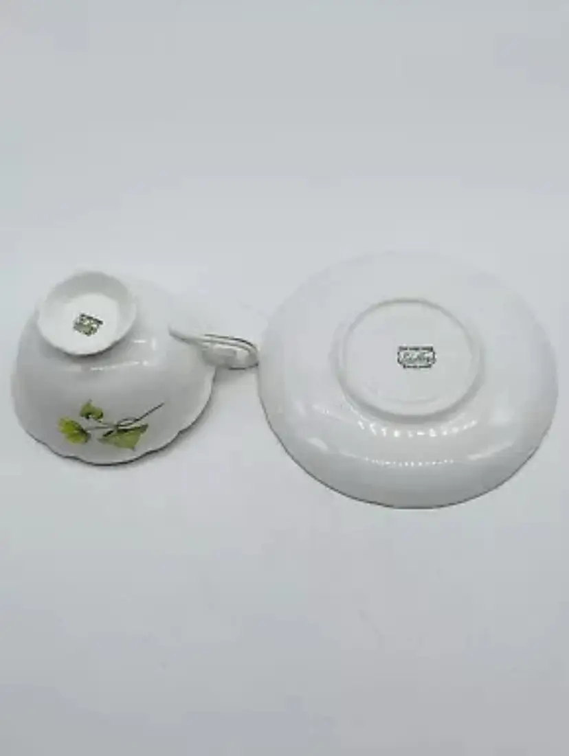 Cup measures 2.5” tall, 4” diameter Saucer measures 5.75” diameter Slight gold paint mark on side from time of painting (see photos)