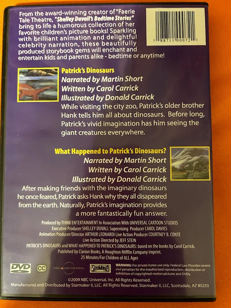 This DVD features the beloved children's character, Shelley Duvall, telling the story of Patrick's Dinosaurs and what happened to them. The video is in the DVD format and was released in 2009. The rating is not rated and falls under the sub-genre of animation/anime. The genre of the DVD is children's and family. Perfect for bedtime or for a fun family gathering, this DVD is sure to entertain and educate children of all ages.