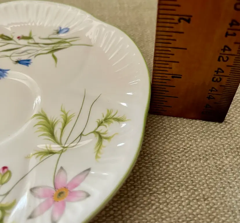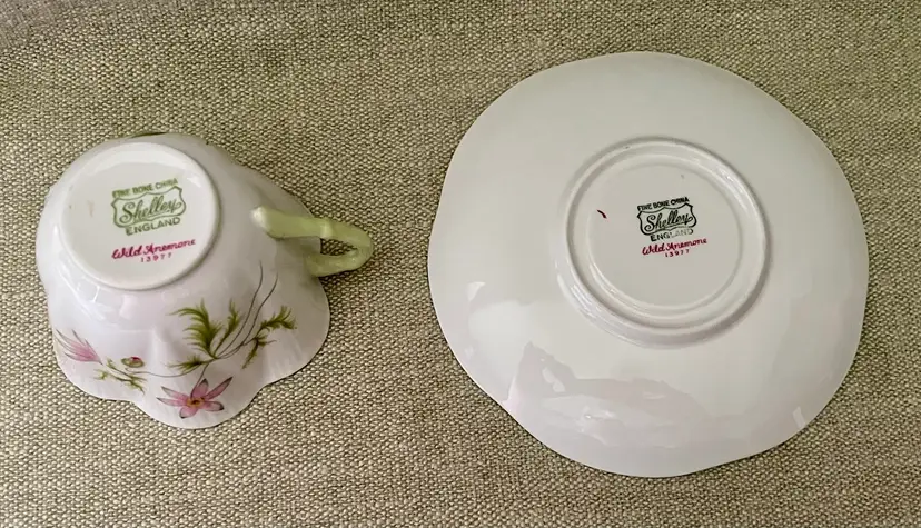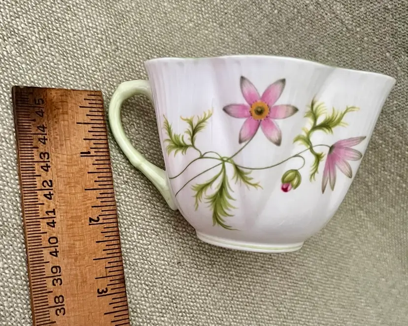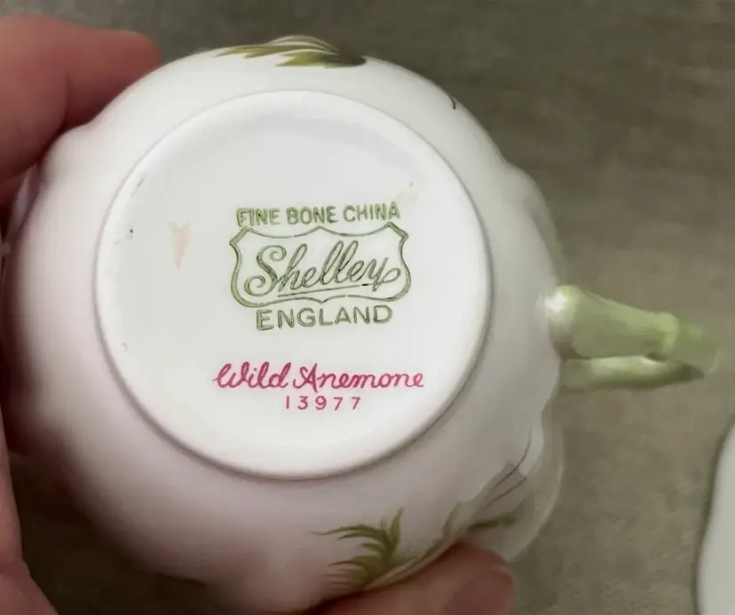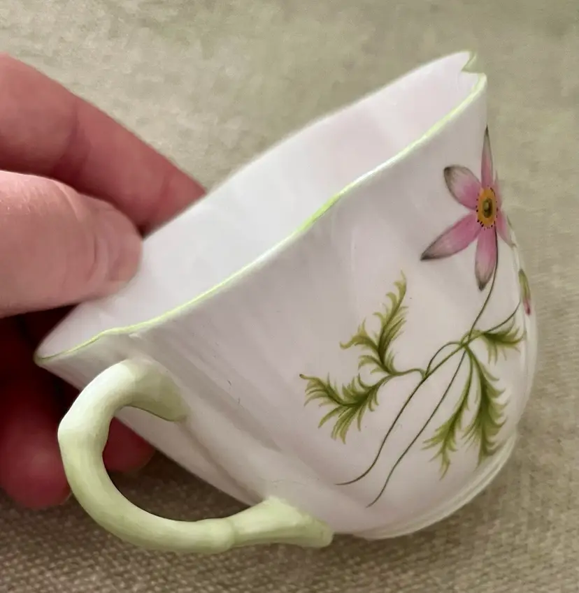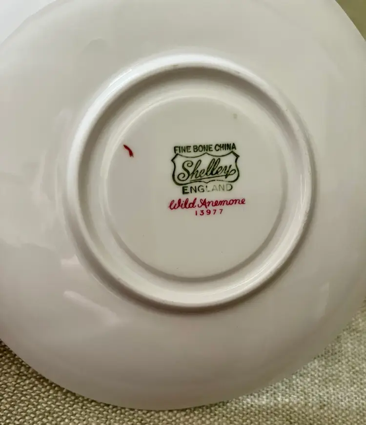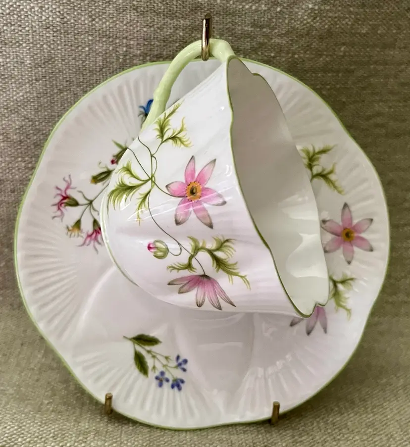 The Shelley Wild Anemone Tea Cup & Saucer No. 13977 is a vintage two-piece set originating from England. Made of bone china with a glossy finish, the set features a floral Wild Anemone pattern on a white background, with a unique green handle. Perfect for the buyer’s occasions, this decorative tea cup and saucer set is a charming addition to any tea lover's collection. (Note: stand is NOT included)