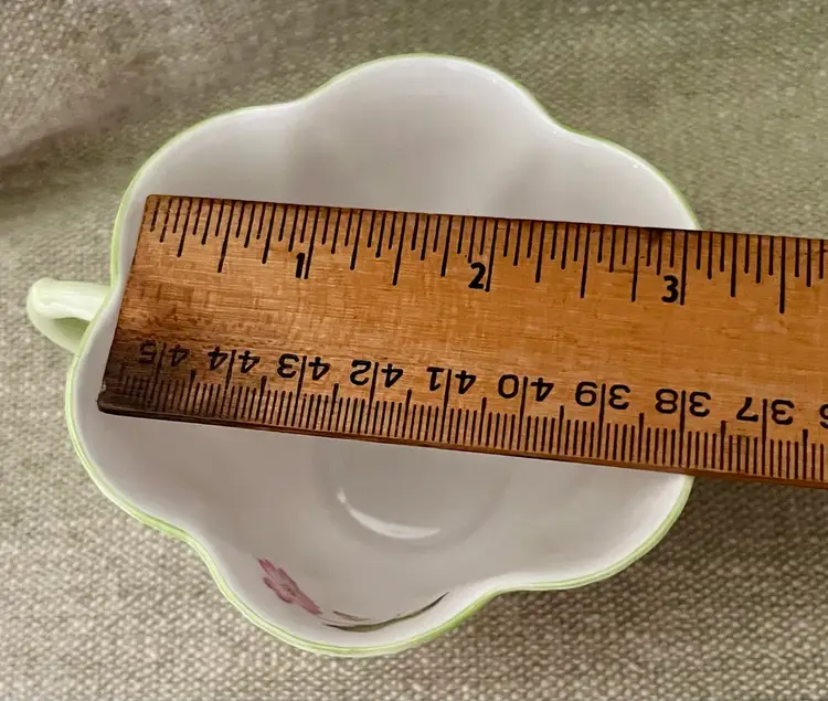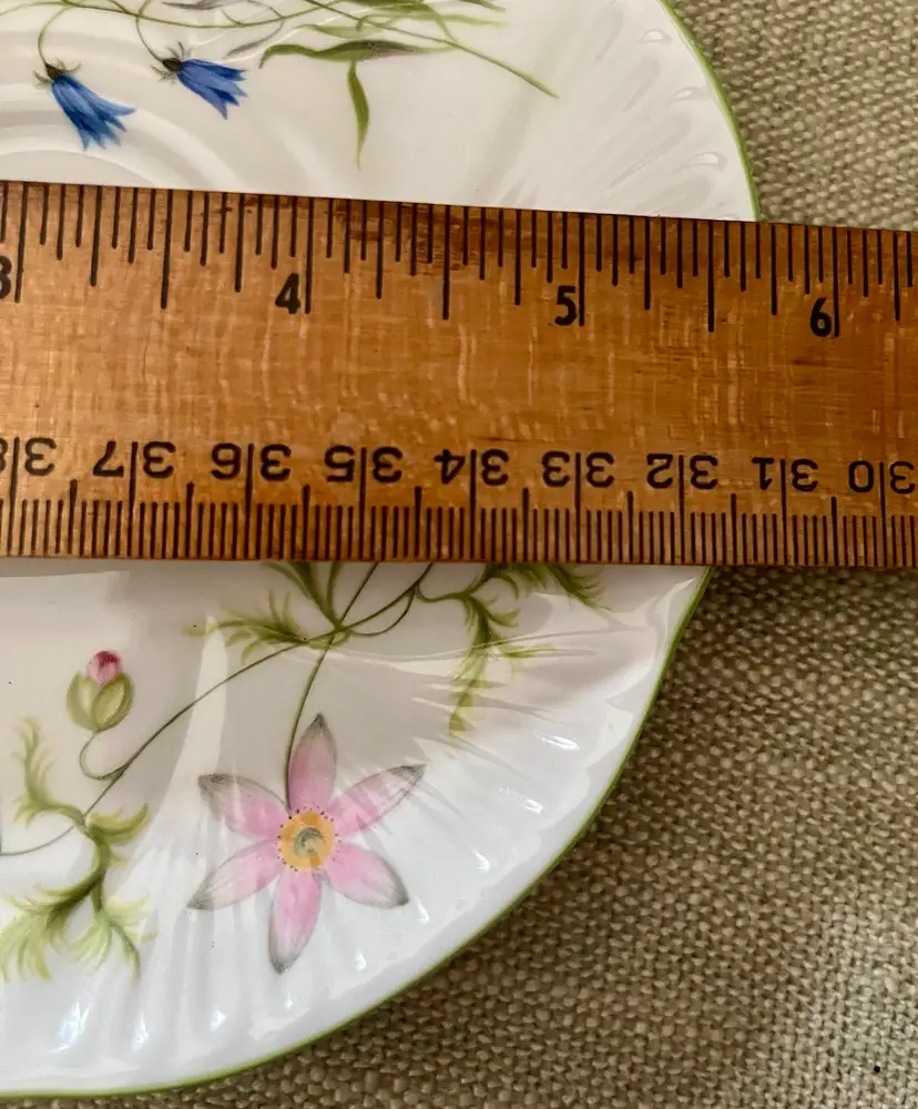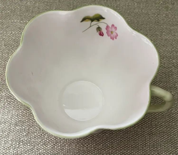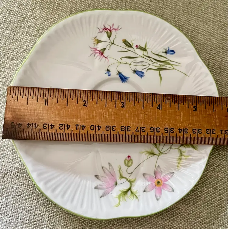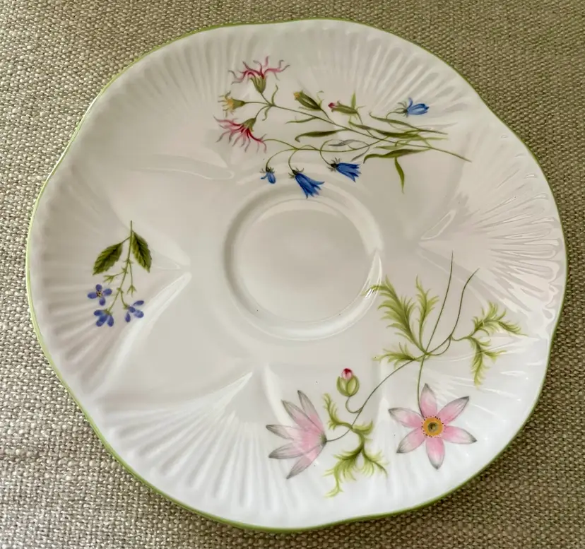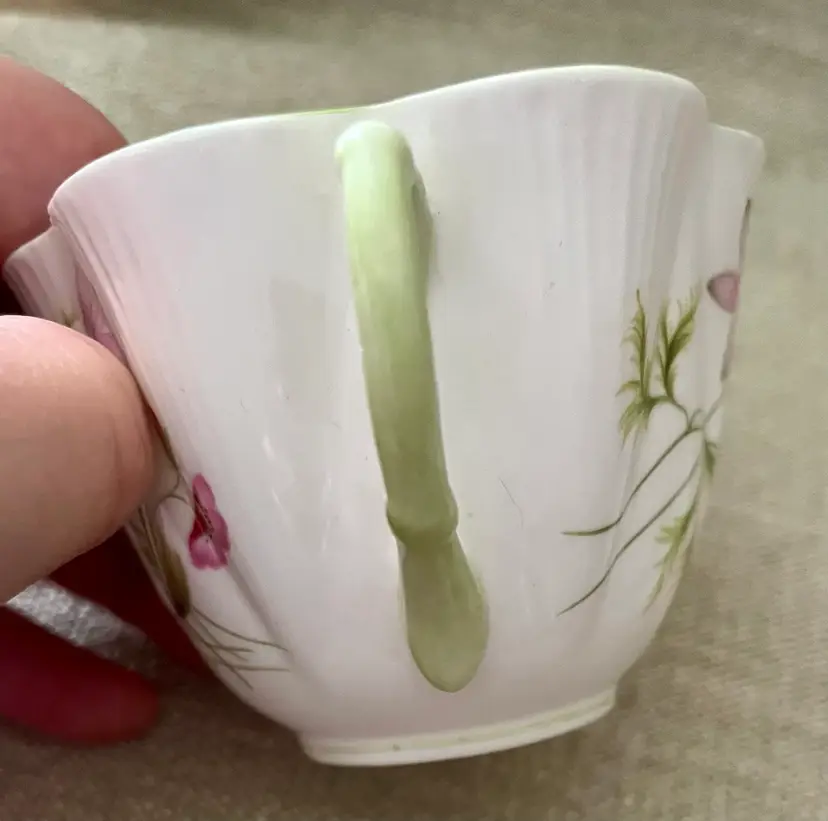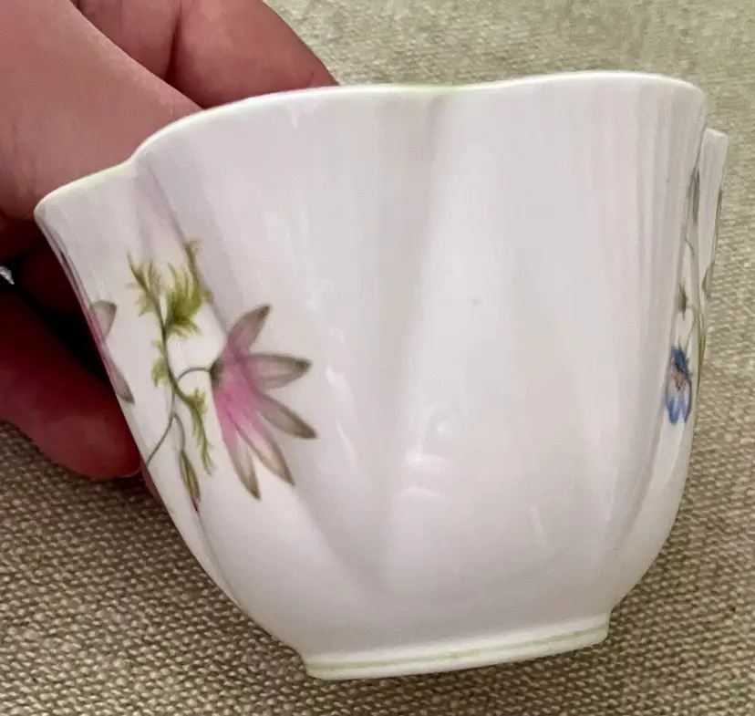 The Shelley Wild Anemone Tea Cup & Saucer No. 13977 is a vintage two-piece set originating from England. Made of bone china with a glossy finish, the set features a floral Wild Anemone pattern on a white background, with a unique green handle. Perfect for the buyer’s occasions, this decorative tea cup and saucer set is a charming addition to any tea lover's collection. (Note: stand is NOT included)