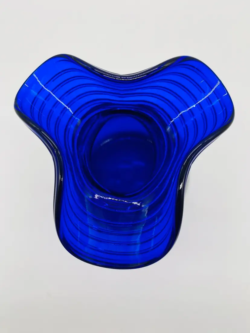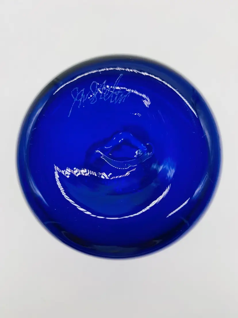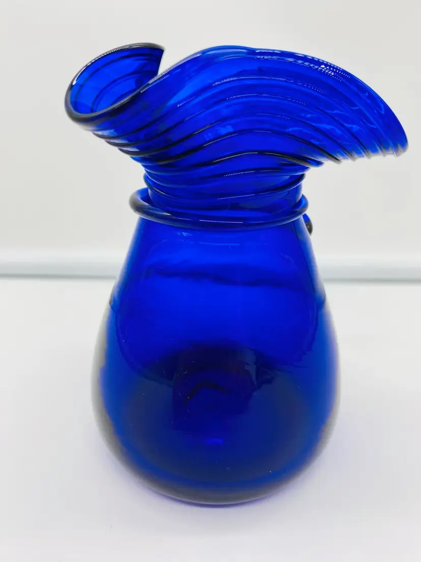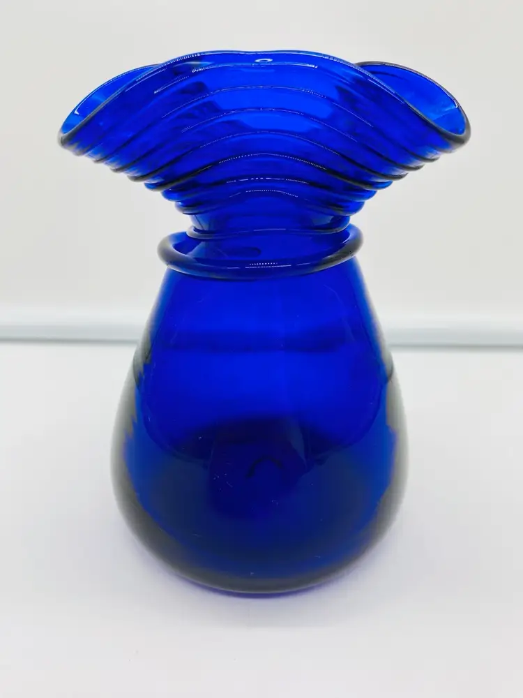 Vase is in very good condition. There is what appears to be sticker residue on the side. It is 5” tall, has a ruffled thread style pattern top. The thread design continues to below the ruffled top giving it a swirled look. It is signed by J Shelton.