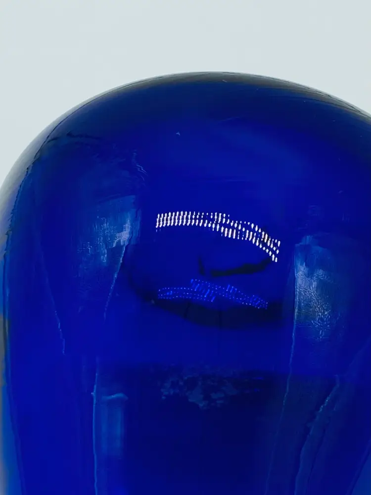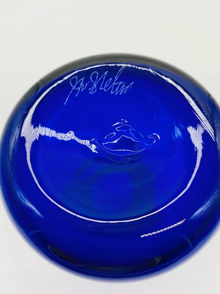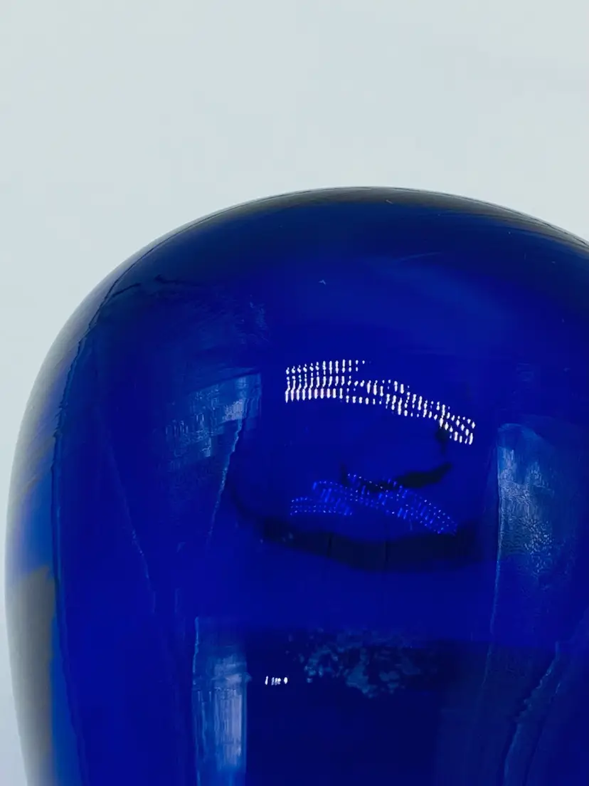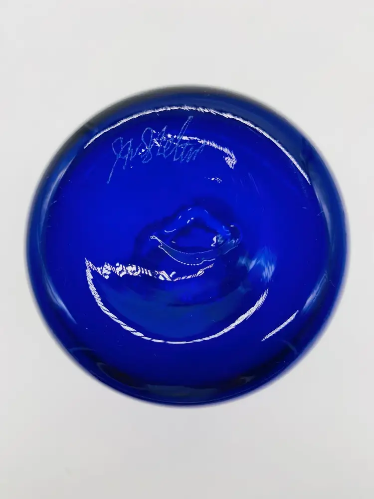 Vase is in very good condition. There is what appears to be sticker residue on the side. It is 5” tall, has a ruffled thread style pattern top. The thread design continues to below the ruffled top giving it a swirled look. It is signed by J Shelton.