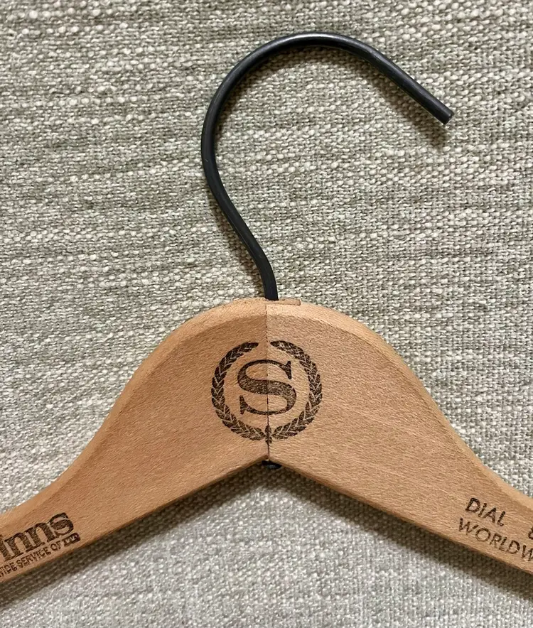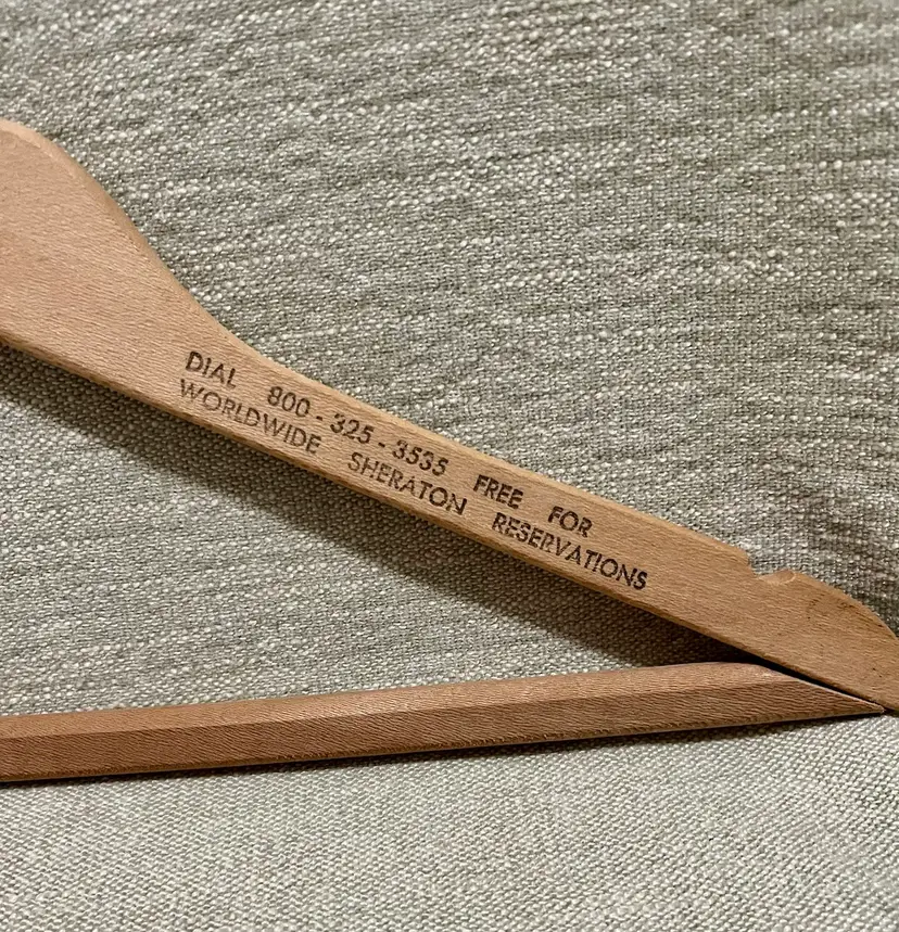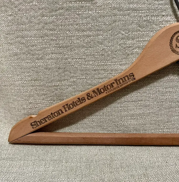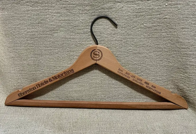 This vintage advertising wooden coat hanger featuring the Sheraton Hotels & Motor Inns logo is a unique and stylish addition to any home, vacation rental, or office. Made of wood, this standard-sized hanger is perfect for everyday. Perfect for those who appreciate vintage accessories and want to add a bit of retro charm to their clothing collection.