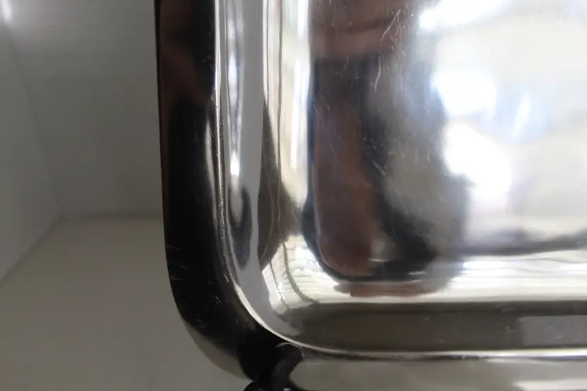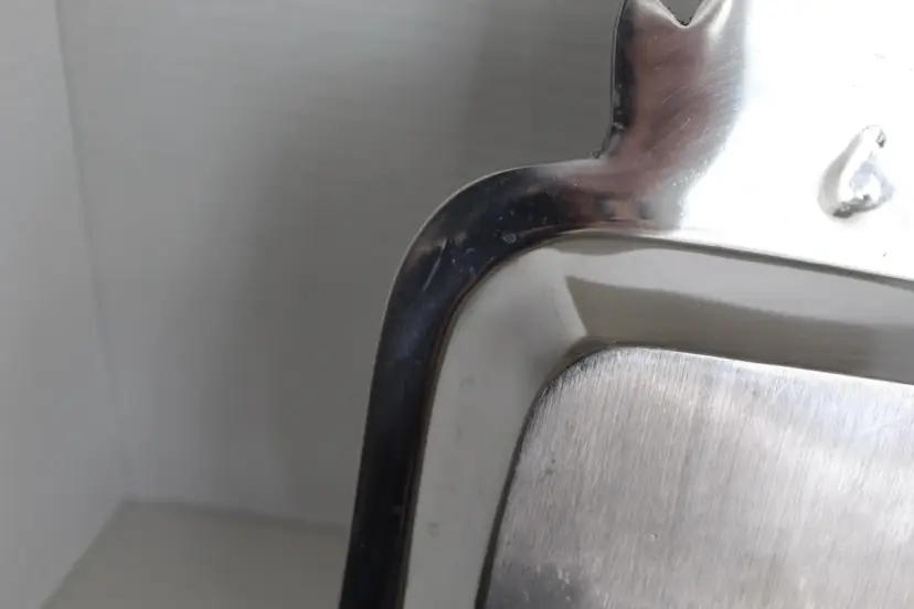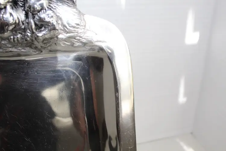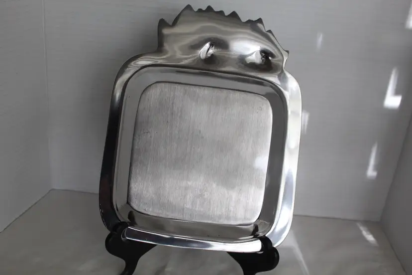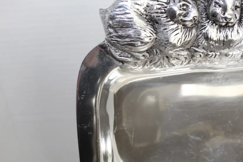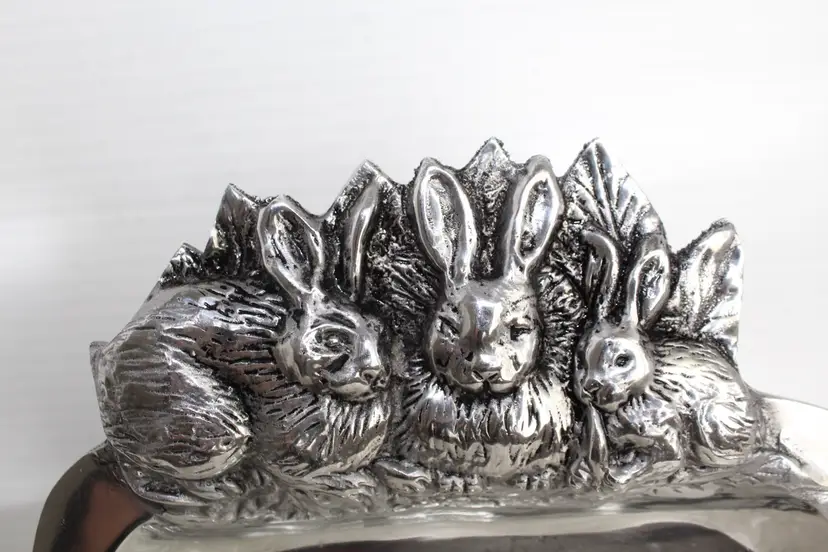 The Sheridan Imports King Arthur Bunnies Candy Snack Dish is a silver plate with a square shape, featuring a cute bunny design perfect for Easter gatherings. Made of aluminum with a glossy finish, this medium-sized dish is ideal for serving snacks or candies in a stylish and decorative way. The brand's reputation for quality and attention to detail ensures that this dish will be a charming addition to any kitchen or dining table. Minor scratching from use is visible in pictures. Bunnies are in excellent condition.