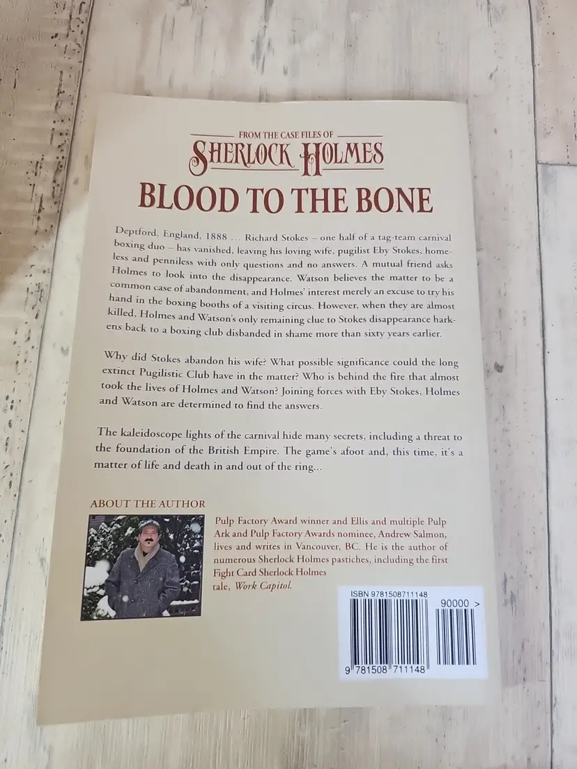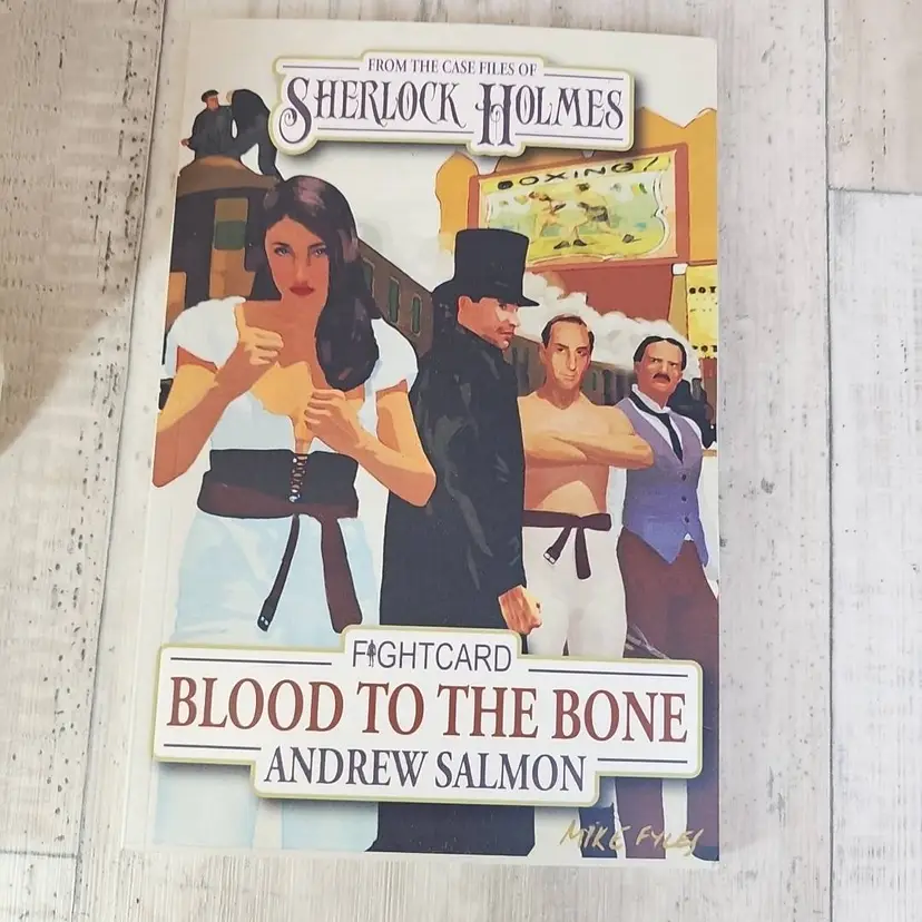 This copy of Blood to the Bone (Fight Card #, by Andrew Salmon & Paul Bishop) is trade paperback, approx. 120 pages. Adventure & mystery set in 1888 Deptford — disappearances, carnival booths, and Holmes in the ring.
