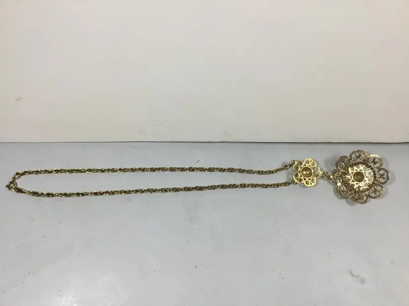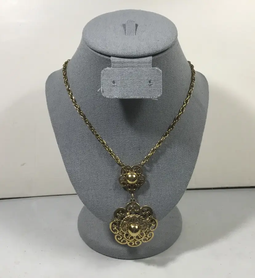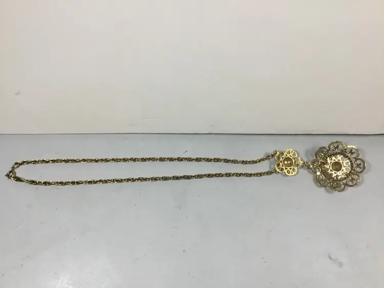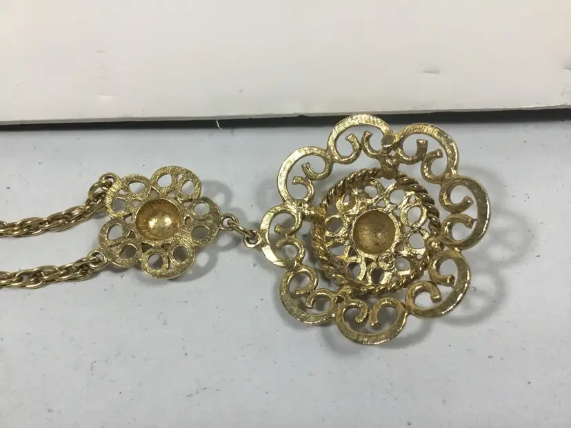 19" double link gold tone chain with 2.5 inch long, double flower pendant. Top pendant is 5 petalled flower attached at 2 top petals, with one jump ring below holding a large, 8 petalled flower. Both have gold tone, domed centers. Spring ring clasp. Tiny signs of wear on BACK of pendant (see photos)