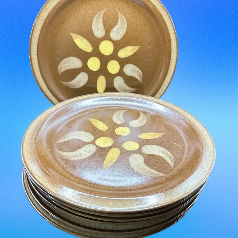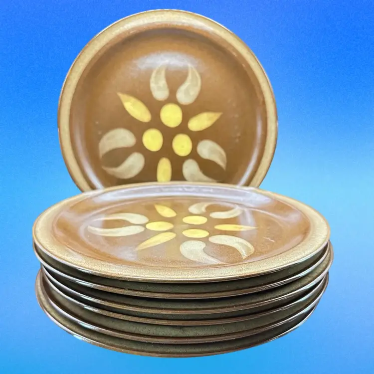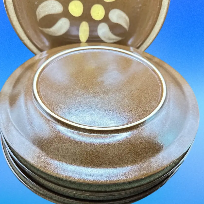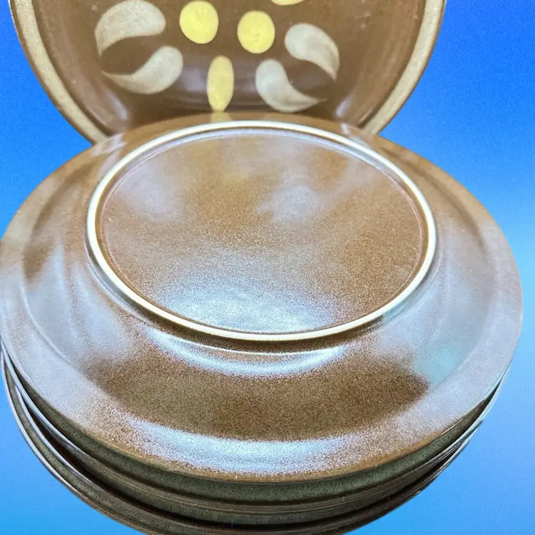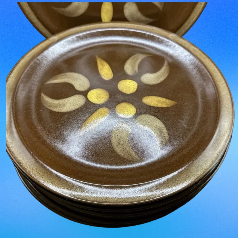 The Shino Stoneware “Nadia" Plates are a set of 7 vintage dinner plates made in Japan during the 1950s. These 10.5 inch stoneware plates feature a mid-century modern design in a matte brown color, perfect for all occasions. With a touch of retro charm, these plates from the Shino Stoneware product line embody the style of the mid-20th century era. No chips, cracks! Very very light sign of wear.