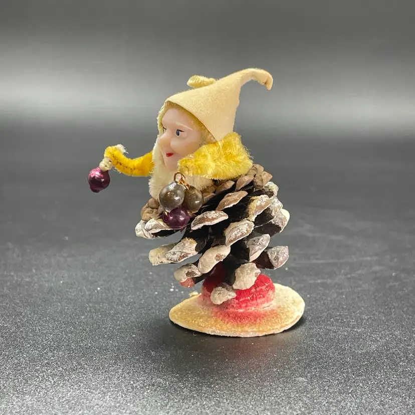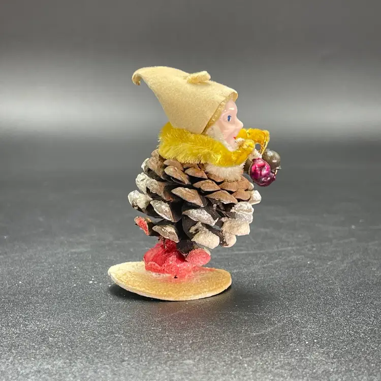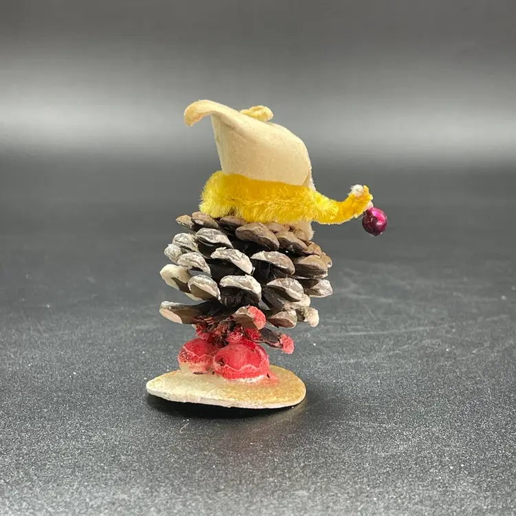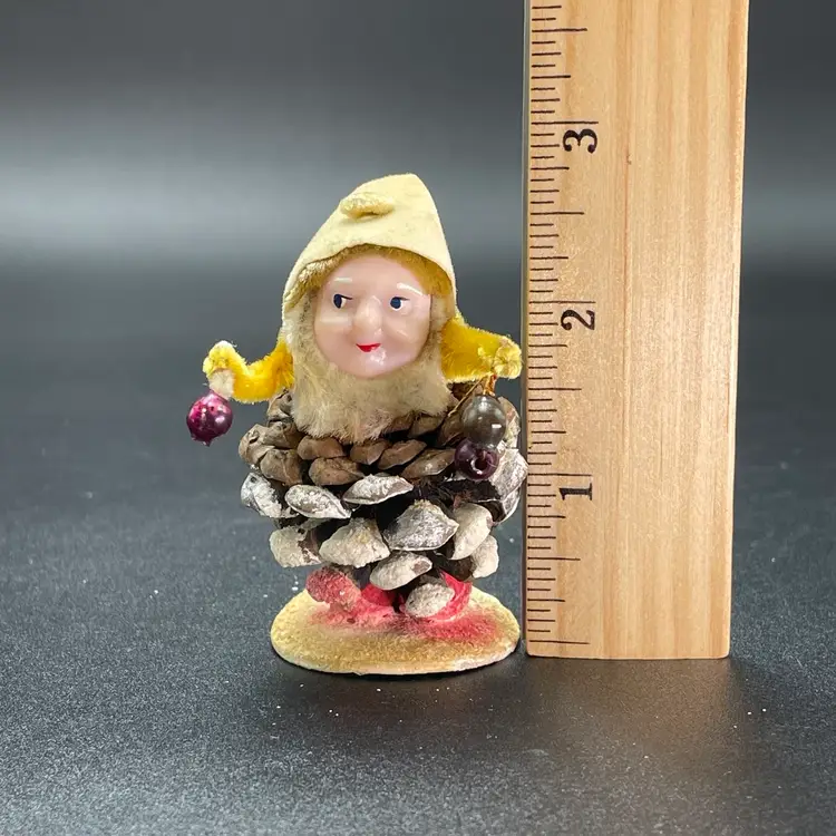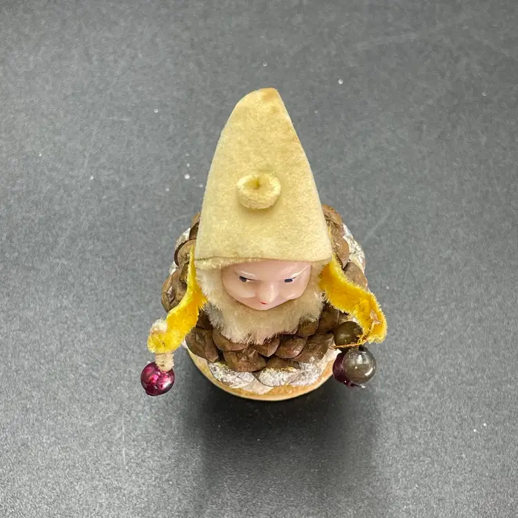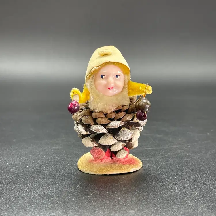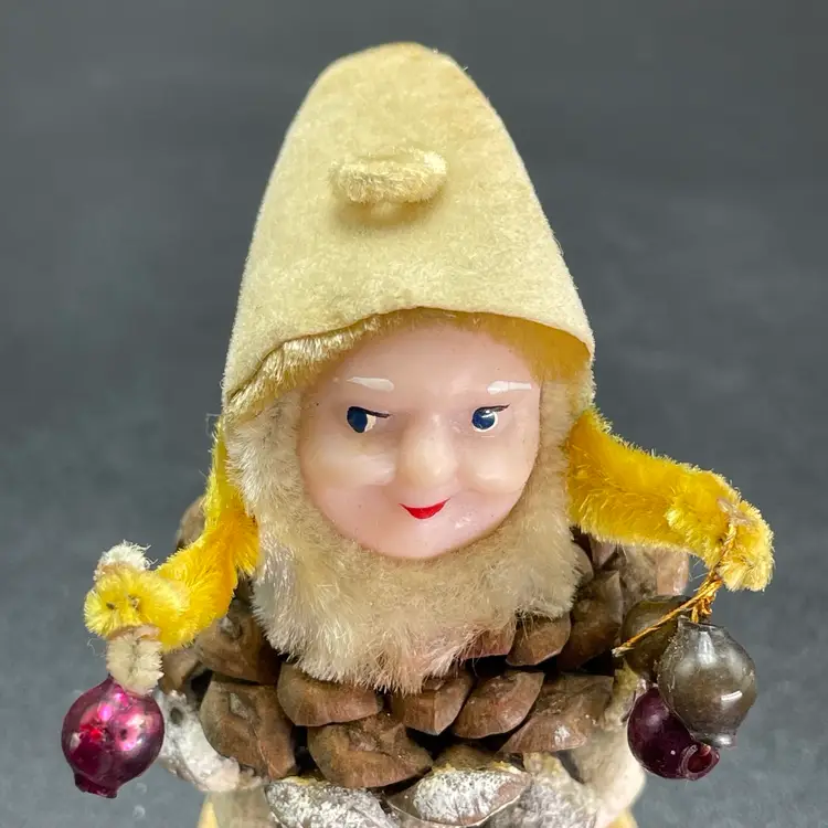 This is a vintage 1950s pinecone and chenille elf with wax face hanging ornament. Made in Japan. Measures approximately 2.75" tall. There is a small stain on the tip of his hat as shown in picture 11. No other major flaws.