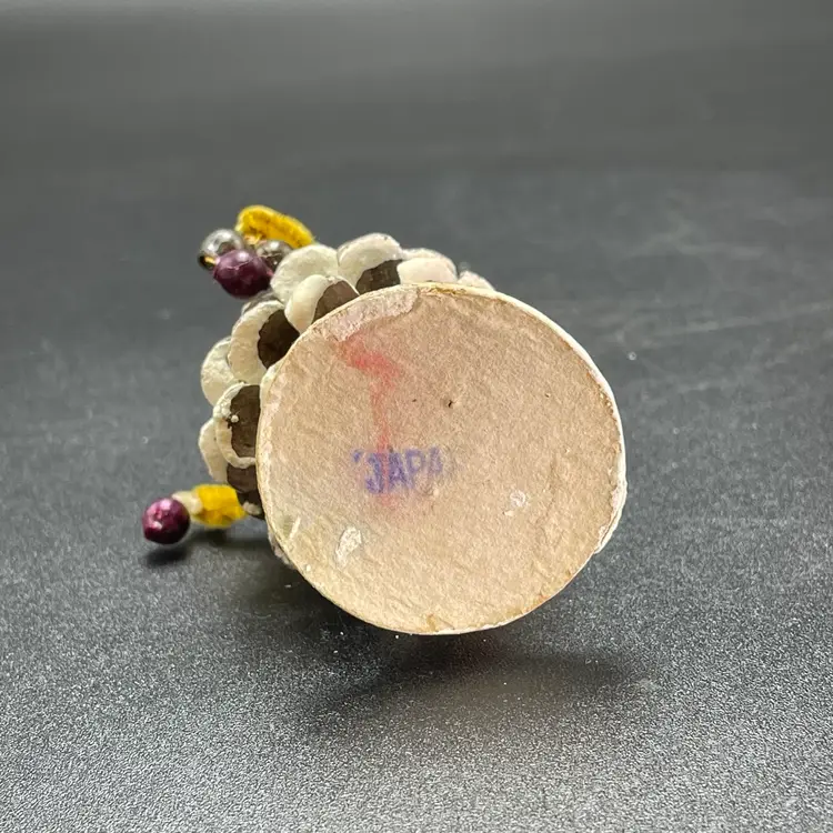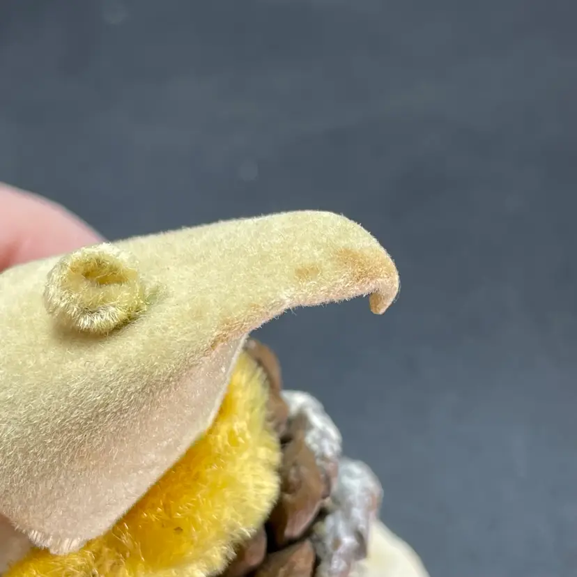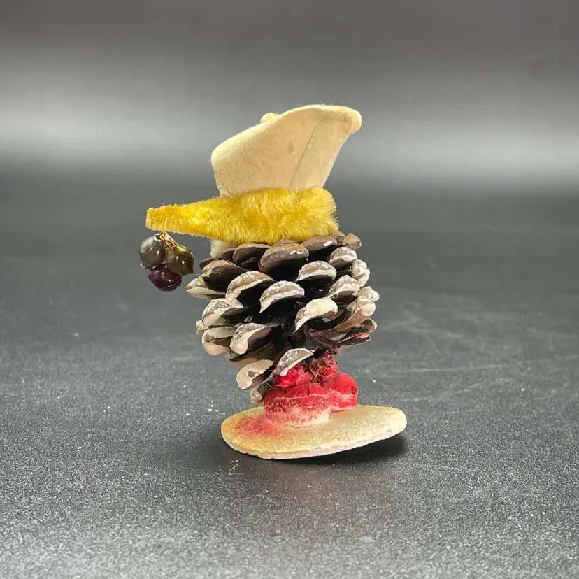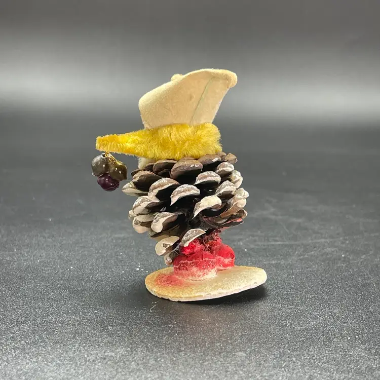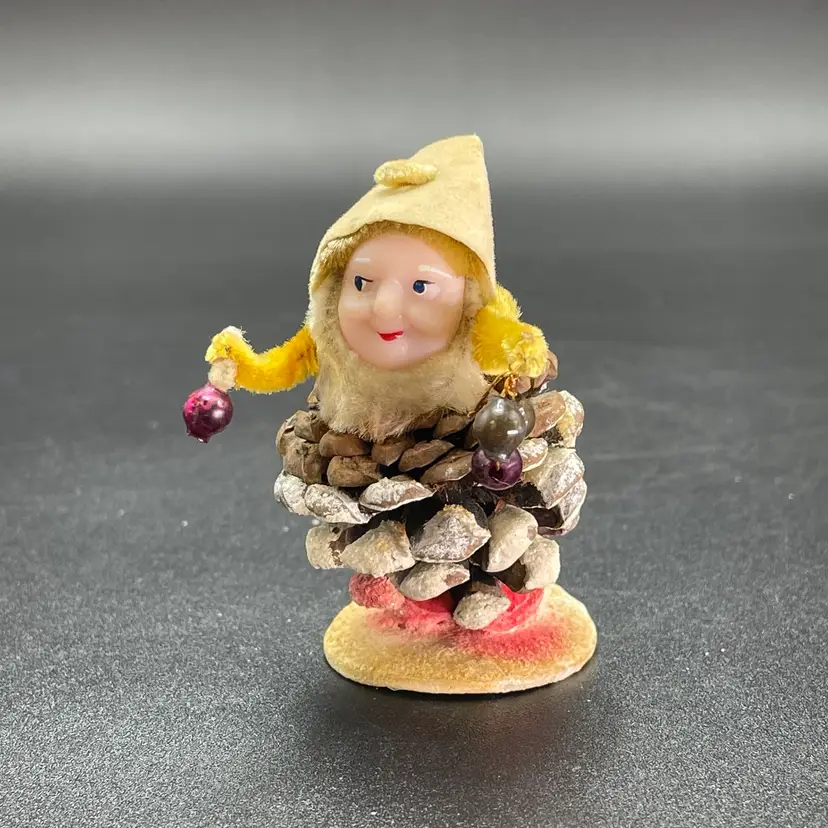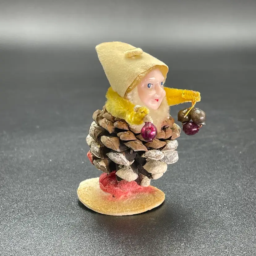 This is a vintage 1950s pinecone and chenille elf with wax face hanging ornament. Made in Japan. Measures approximately 2.75" tall. There is a small stain on the tip of his hat as shown in picture 11. No other major flaws.